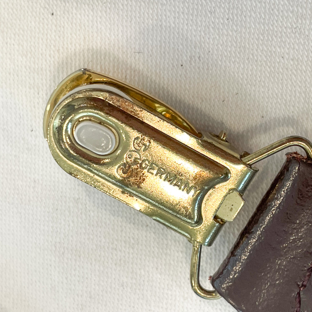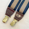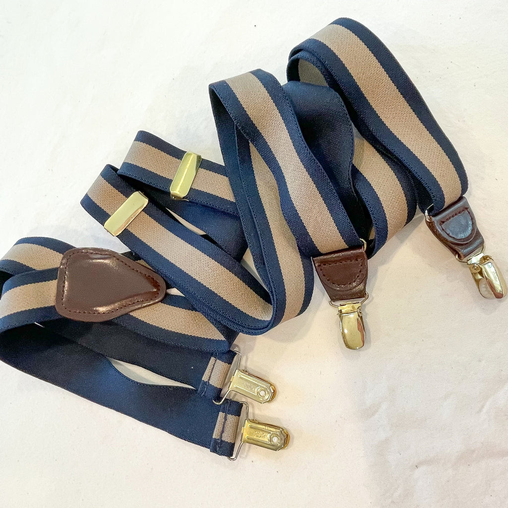 Vintage suspenders navy and taupe striped elastic stretch suspenders with brown leather and brass clips.