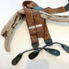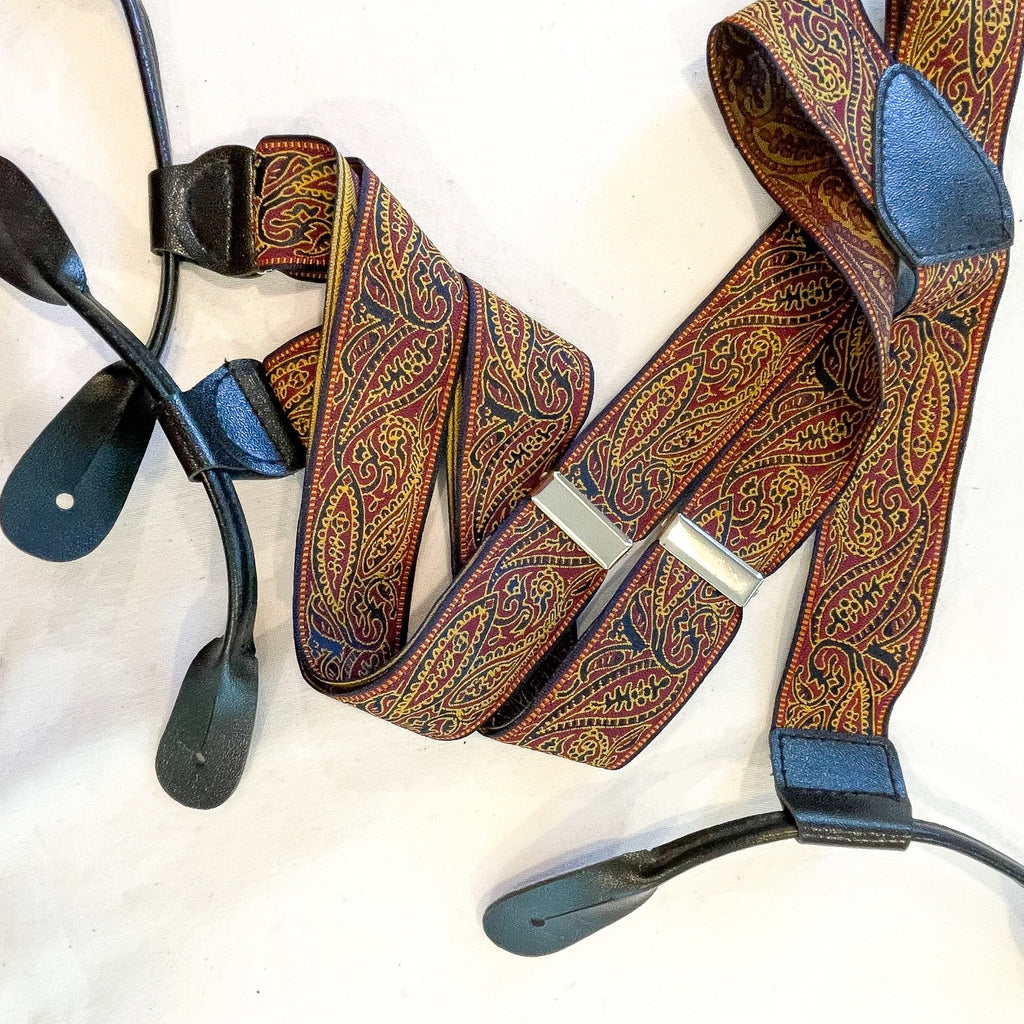Vintage paisley suspenders, woven ribbon like banding, black leather straps and brass clips for length adjustment. Non stretch.