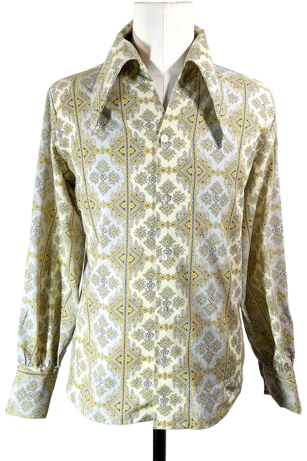 SOLD Triumph Vintage 70s Cotton Hippie Shirt, Mod Novelty Print Large Pointed Collar M