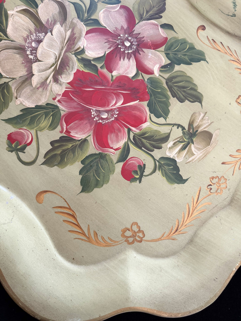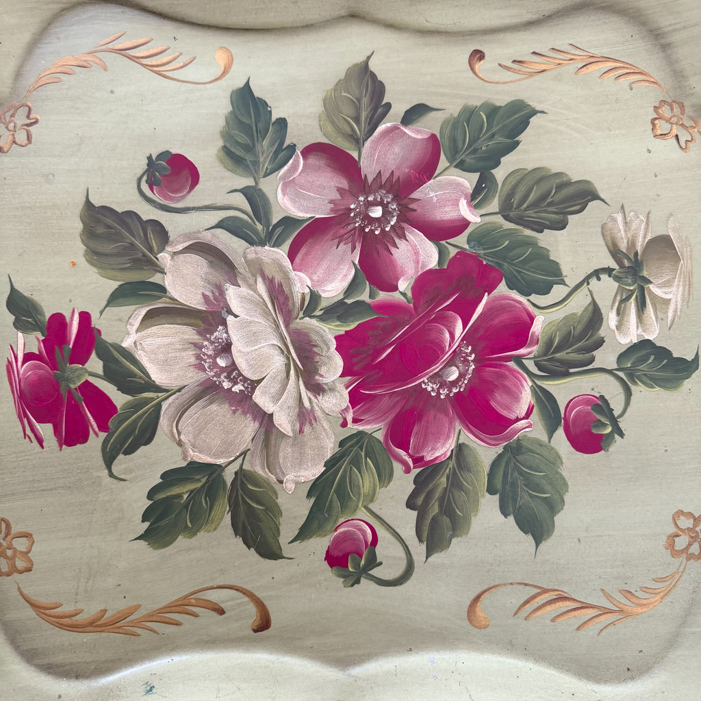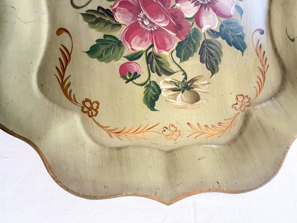 Celery/sage green tray accented with gold details and full lovely flowers in pink, maroon and taupe. Antiqued brushed finish. *It was difficult to show the accurate color in photos.