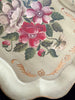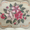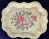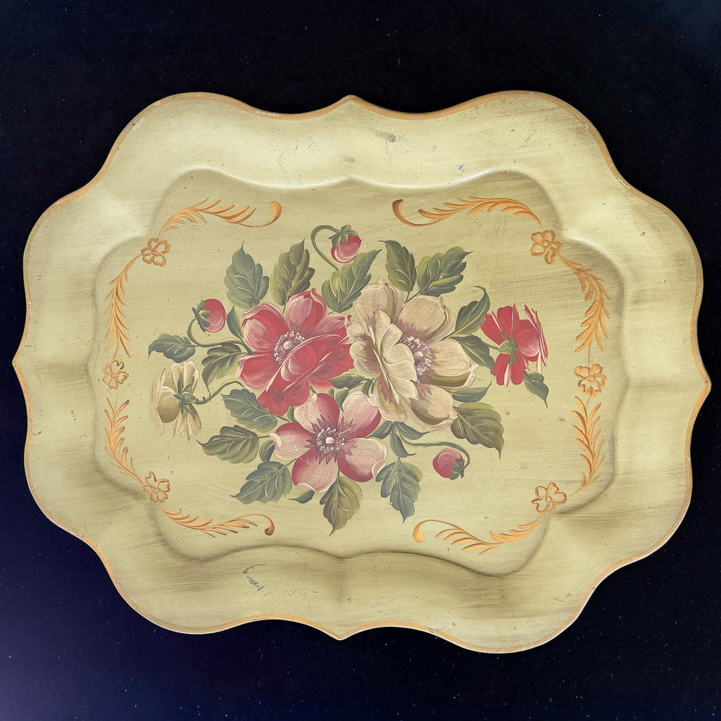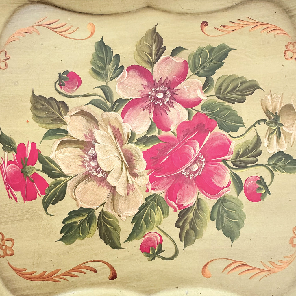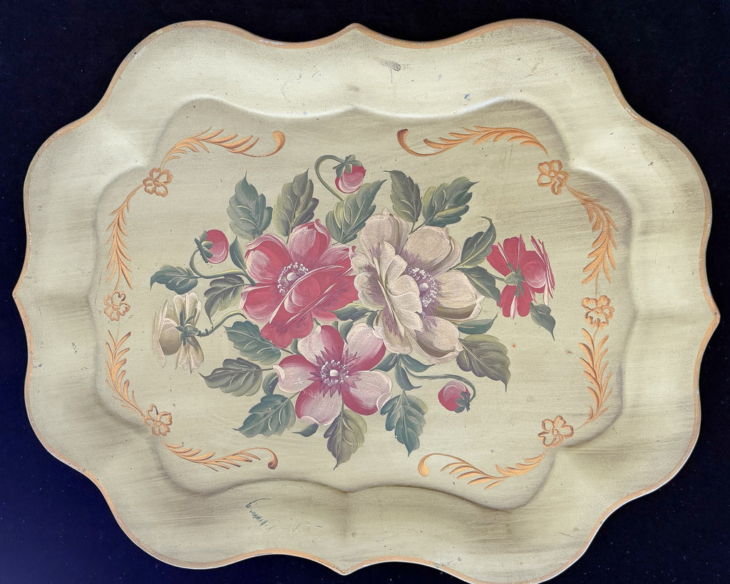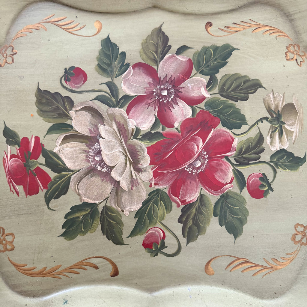 Celery/sage green tray accented with gold details and full lovely flowers in pink, maroon and taupe. Antiqued brushed finish. *It was difficult to show the accurate color in photos.