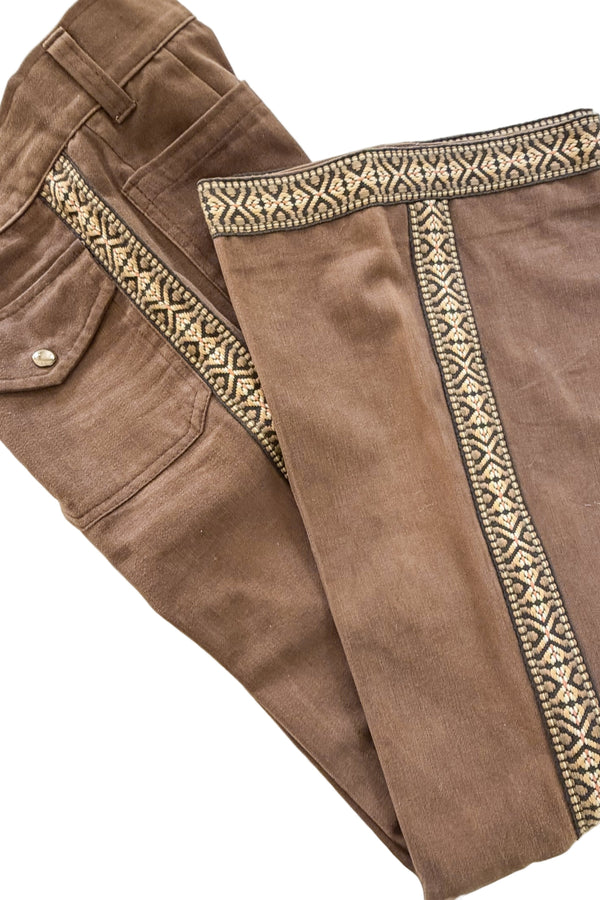 Vintage Brown Bell Bottom Jeans, Tapestry Banding, 70s/80s Hippie Pants 29" Waist