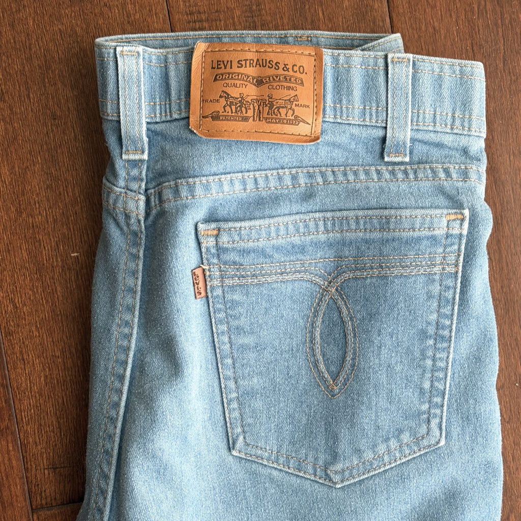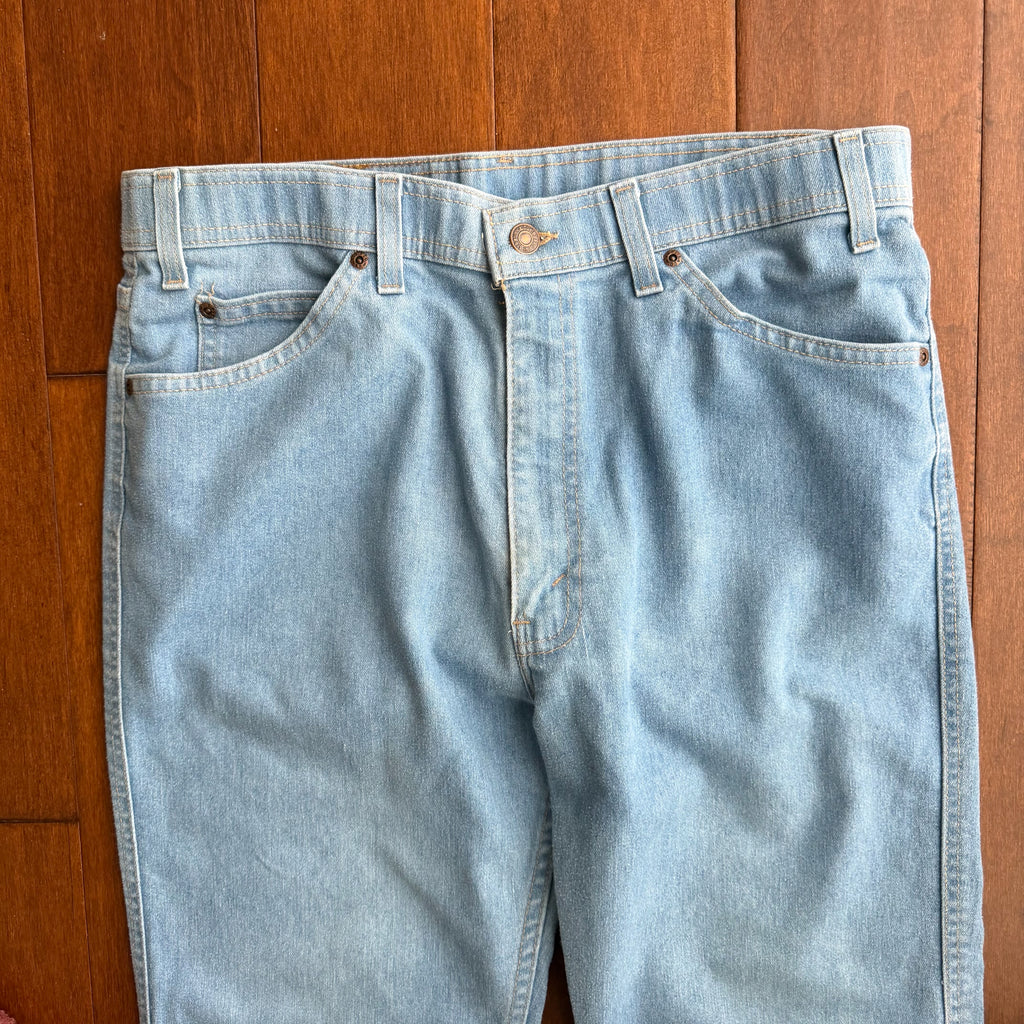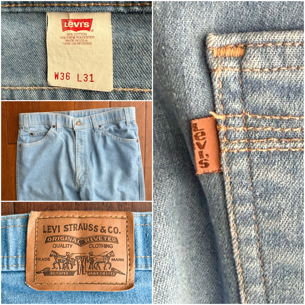 TAG: Levi Strauss & Co Paper tag on waistband, brown Levi's tab on pocket. Levi's, made in USA, 50/50 Cotton Polyester. #1539B 57.