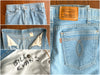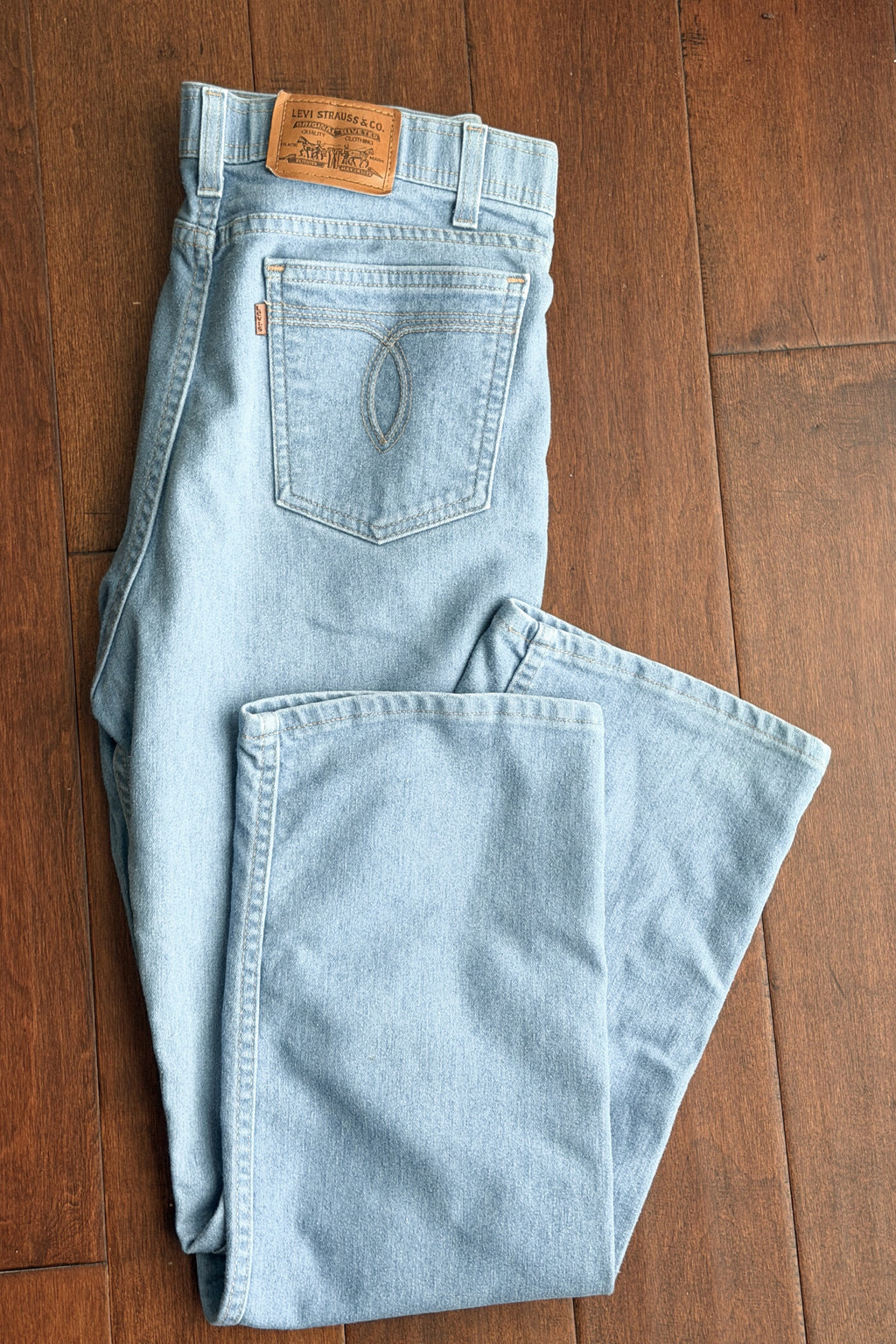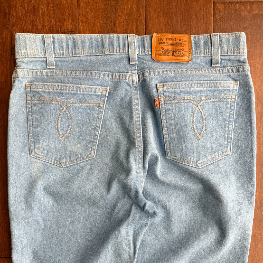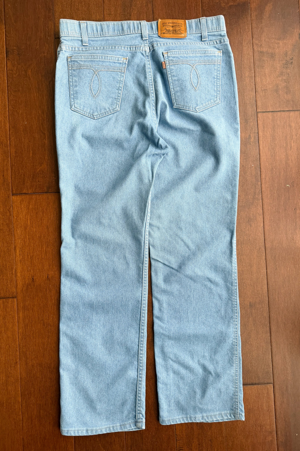 TAG: Levi Strauss & Co Paper tag on waistband, brown Levi's tab on pocket. Levi's, made in USA, 50/50 Cotton Polyester. #1539B 57.