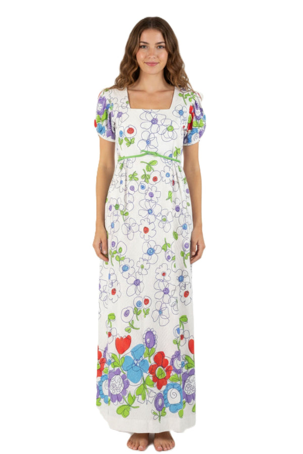 60s MOD Cream Maxi Dress, Applique Flowers S