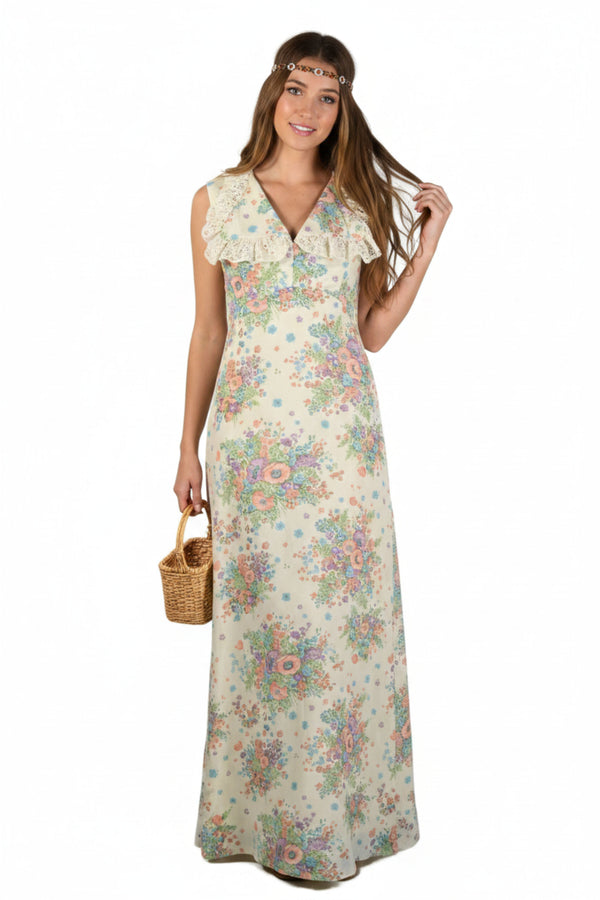 Vintage 60s/70s Floral Print Empire Waist Sleeveless Maxi Dress M