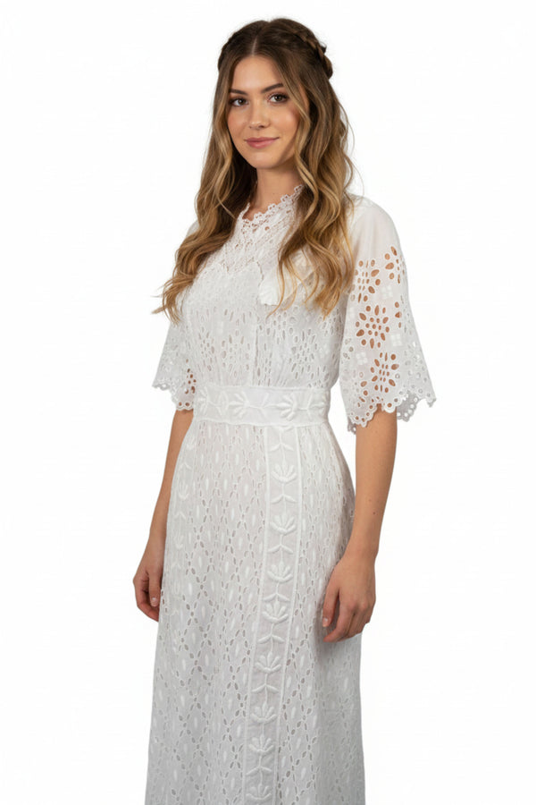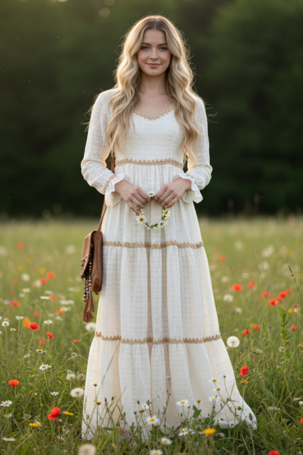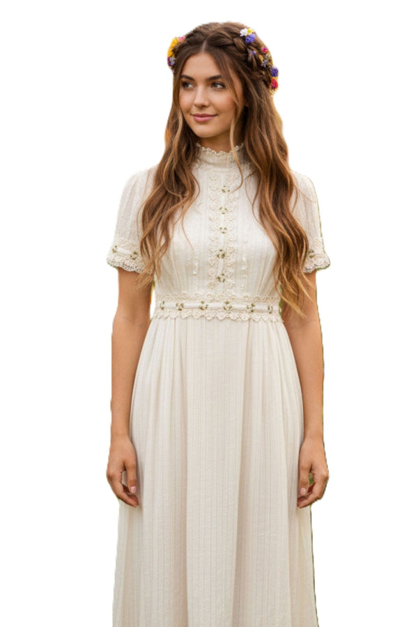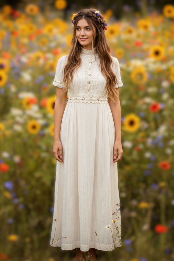 60s/70s White Lace Maxi Dress Embroidered Details, Boho Hippie Maxi Dress