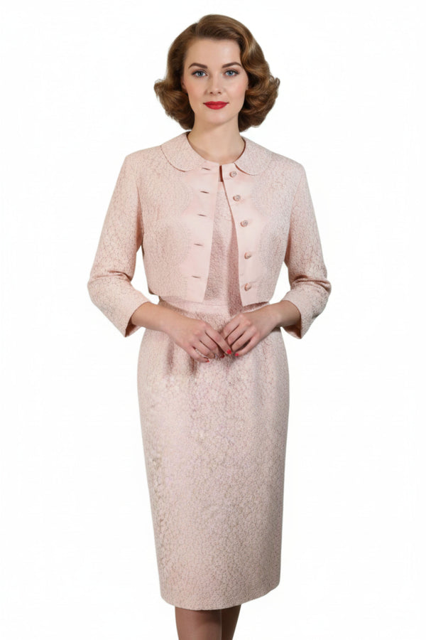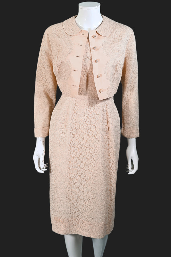 Vintage 50s Blush Pink Lace Dress + Jacket, 2 Piece Suit, Rhinestone Buttons S