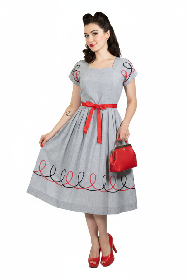 Vintage 40s Grey Gingham Dress Red/Black Trim, Sun Seeker M
