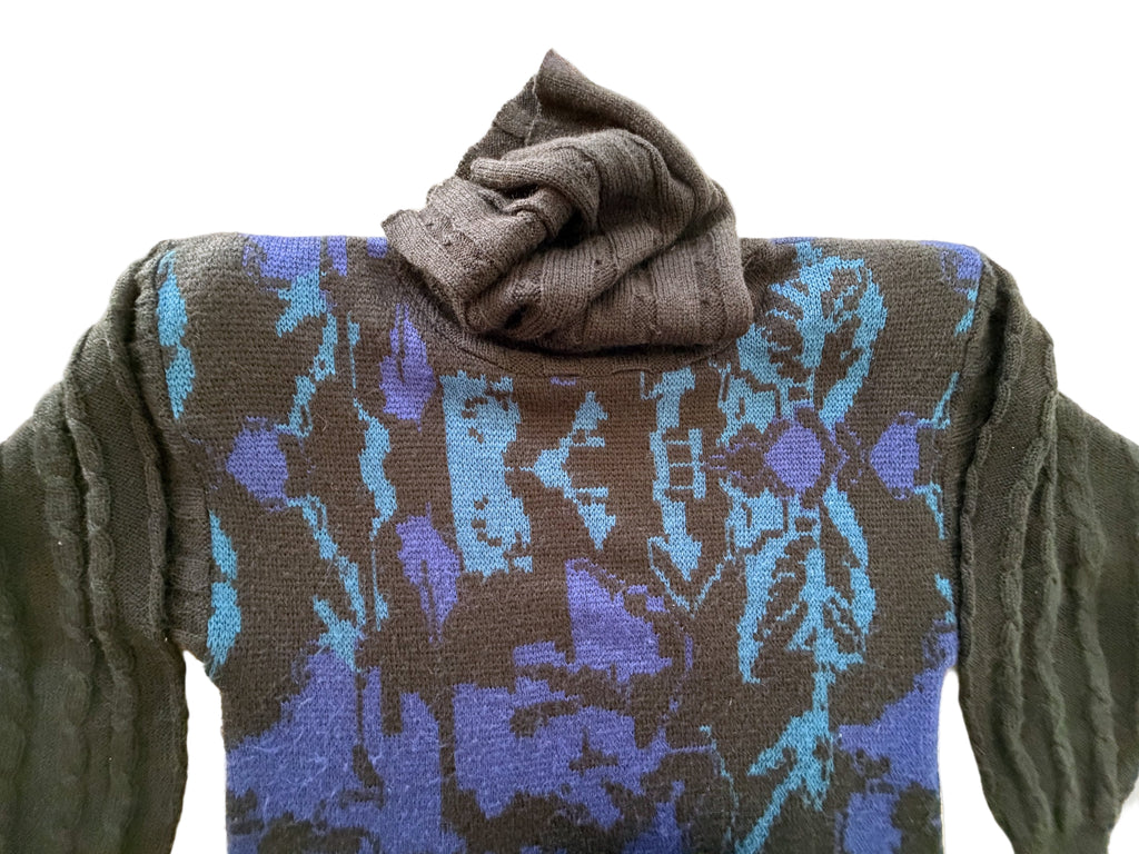 80s sweater dress with very wide shoulders and shoulder pads, abstract pattern.