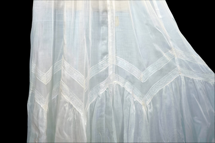 Stunning antique white dress accented with inset lace at neckline, bodice, and skirt.