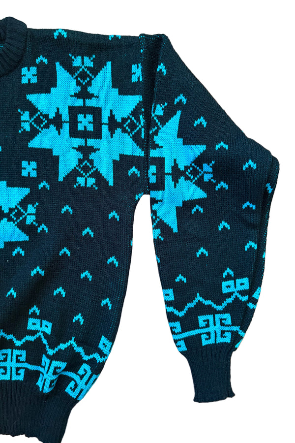 80s Blacl/Turquoise Snowflake Sweater, Pullover Acrylic Hipster Sweater M
