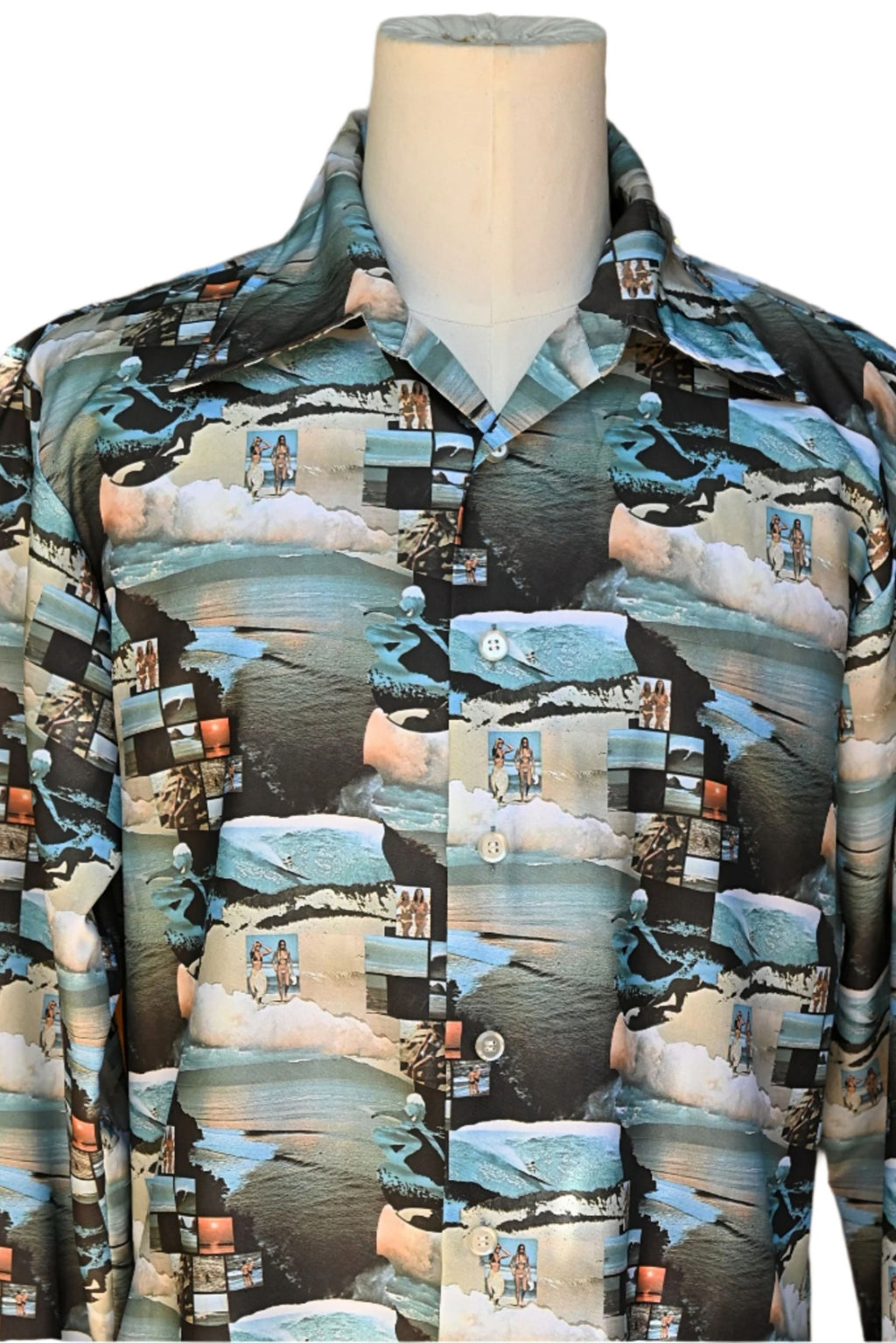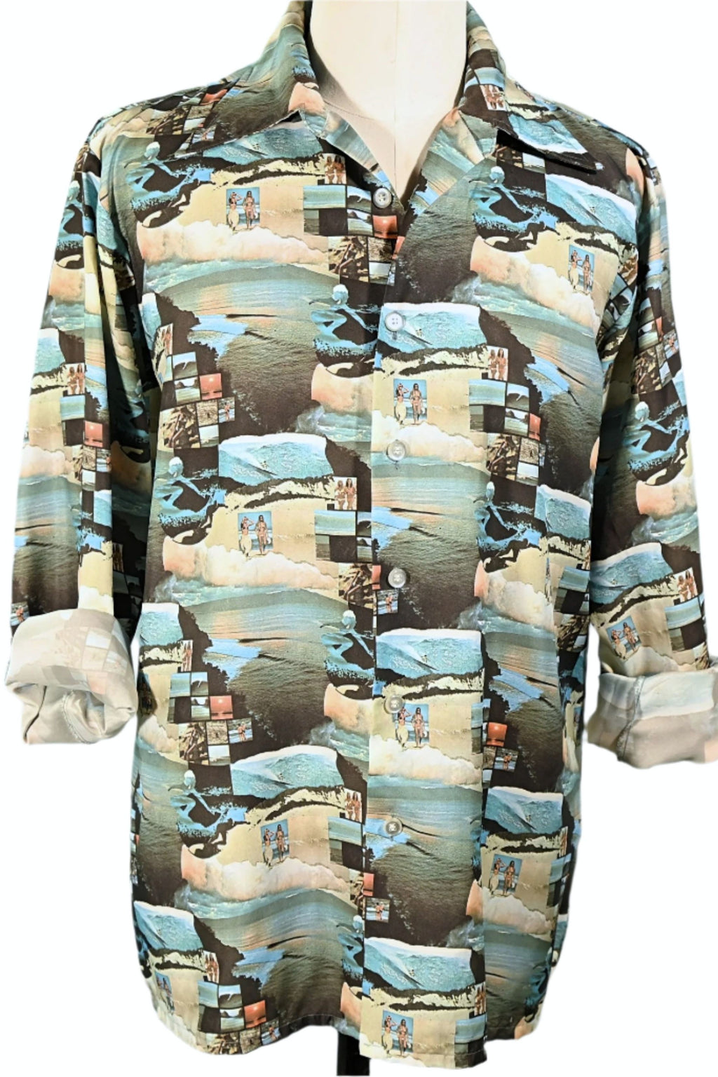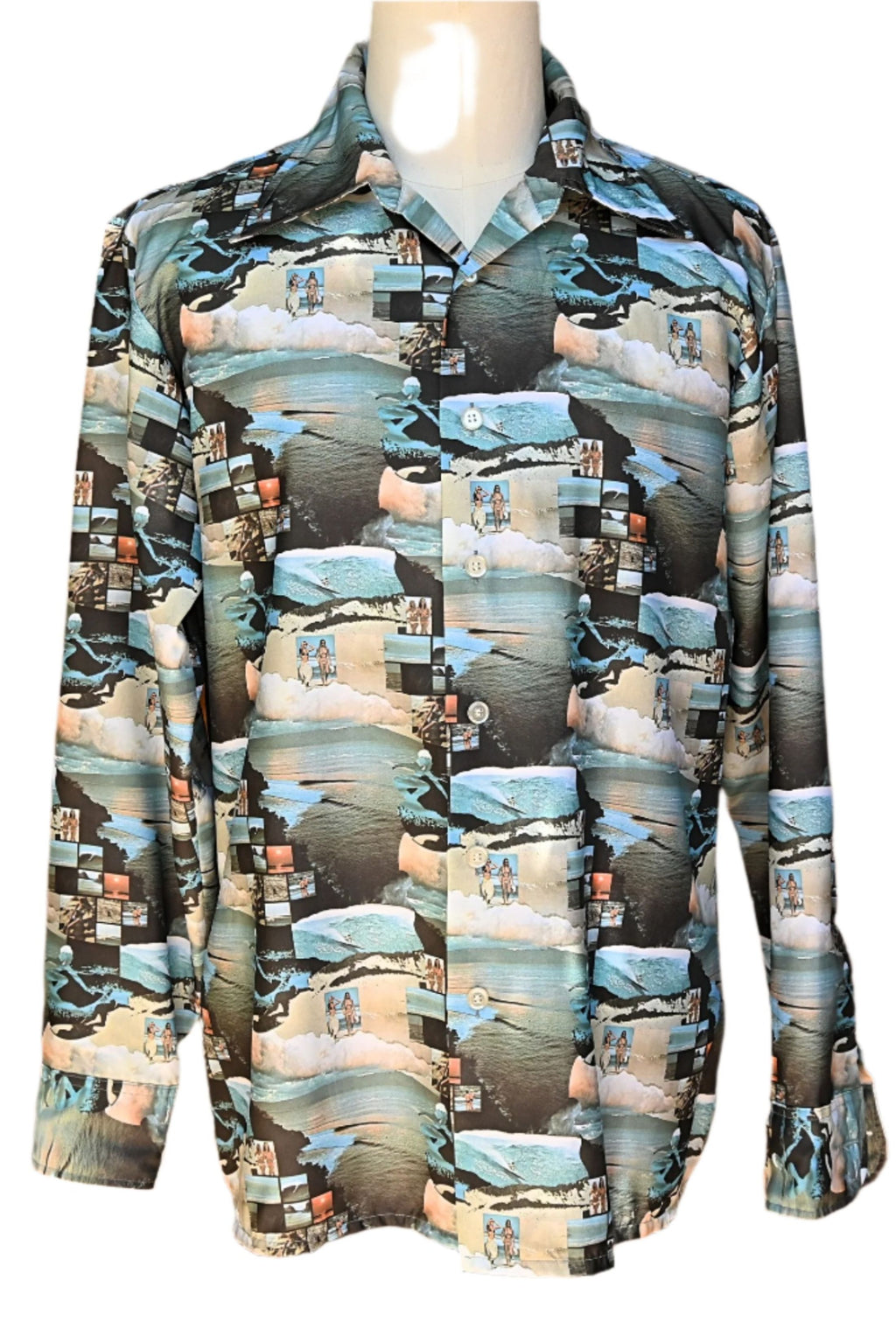 Vintage 70s photo image shirt with beach, surfers & beach bunnies.