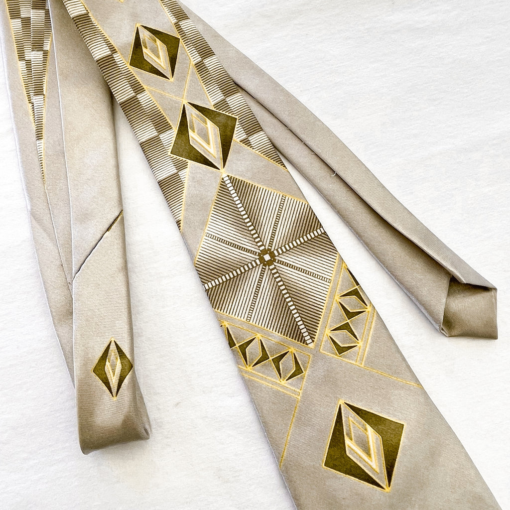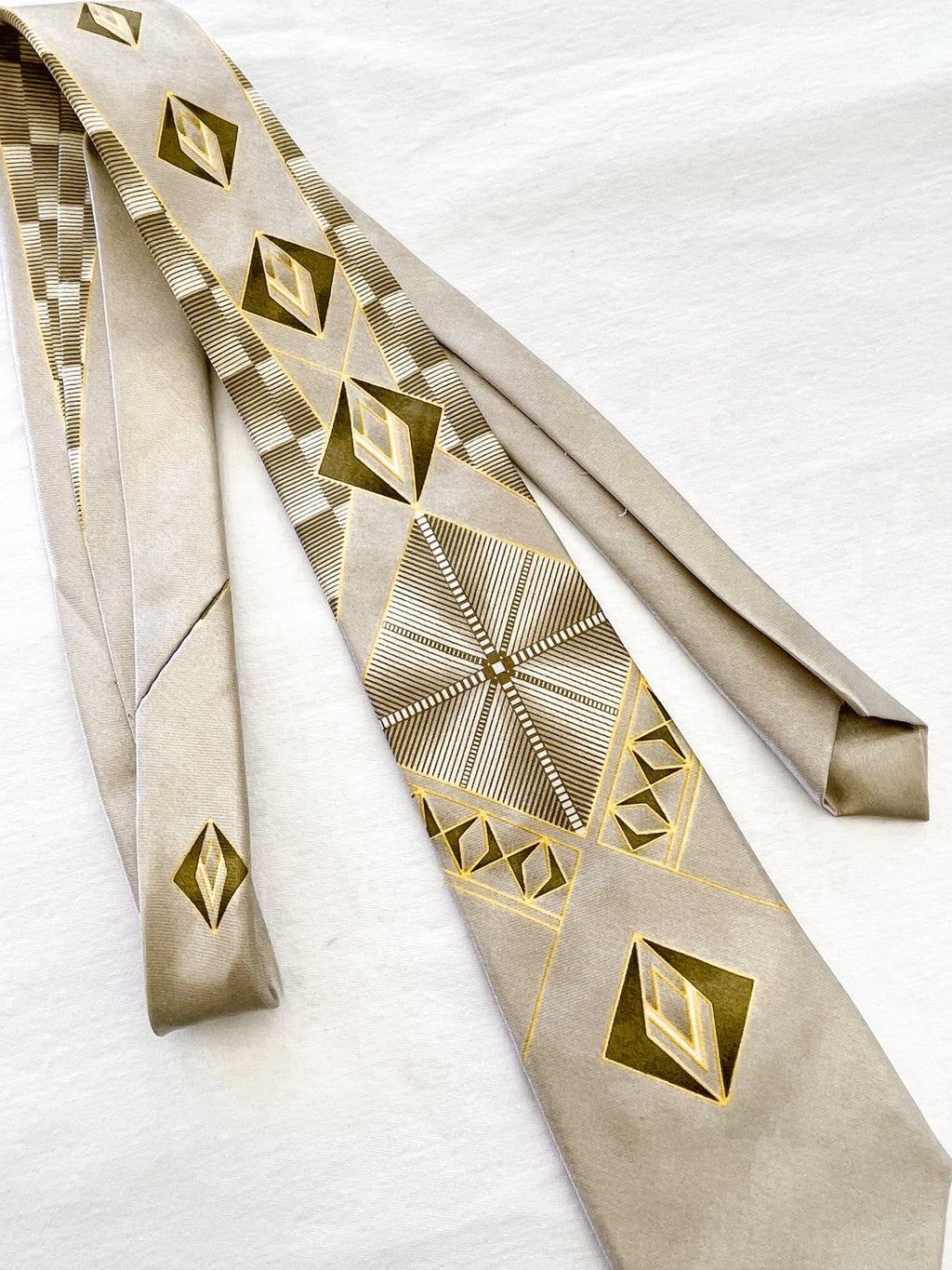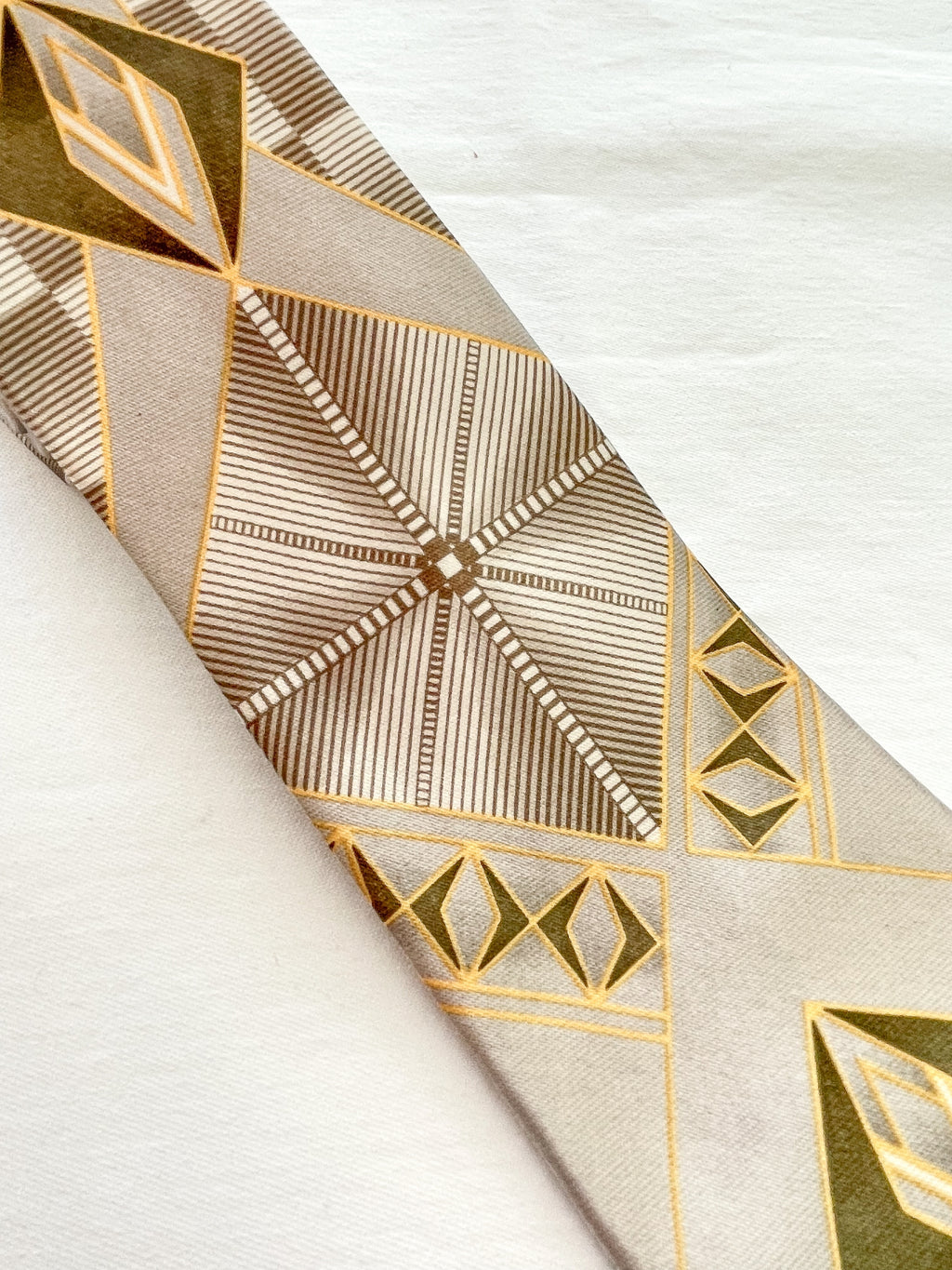 Taupe ground color, yellow brown & deep green accent colors. *The colors were very hard to adjust the tie is not grey it is taupe, the triangles are deep avocado green, yellow & brown details.
