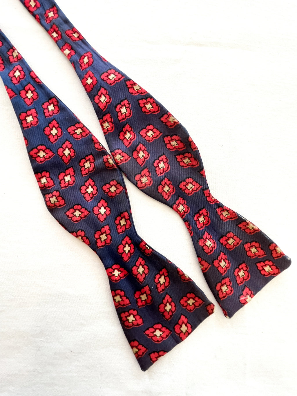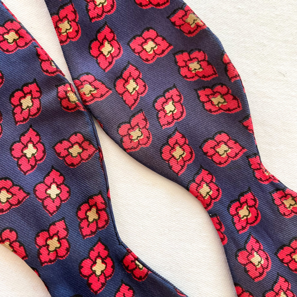 Vintage blue and red floral print bowtie. Silky fabric, content unmarked.