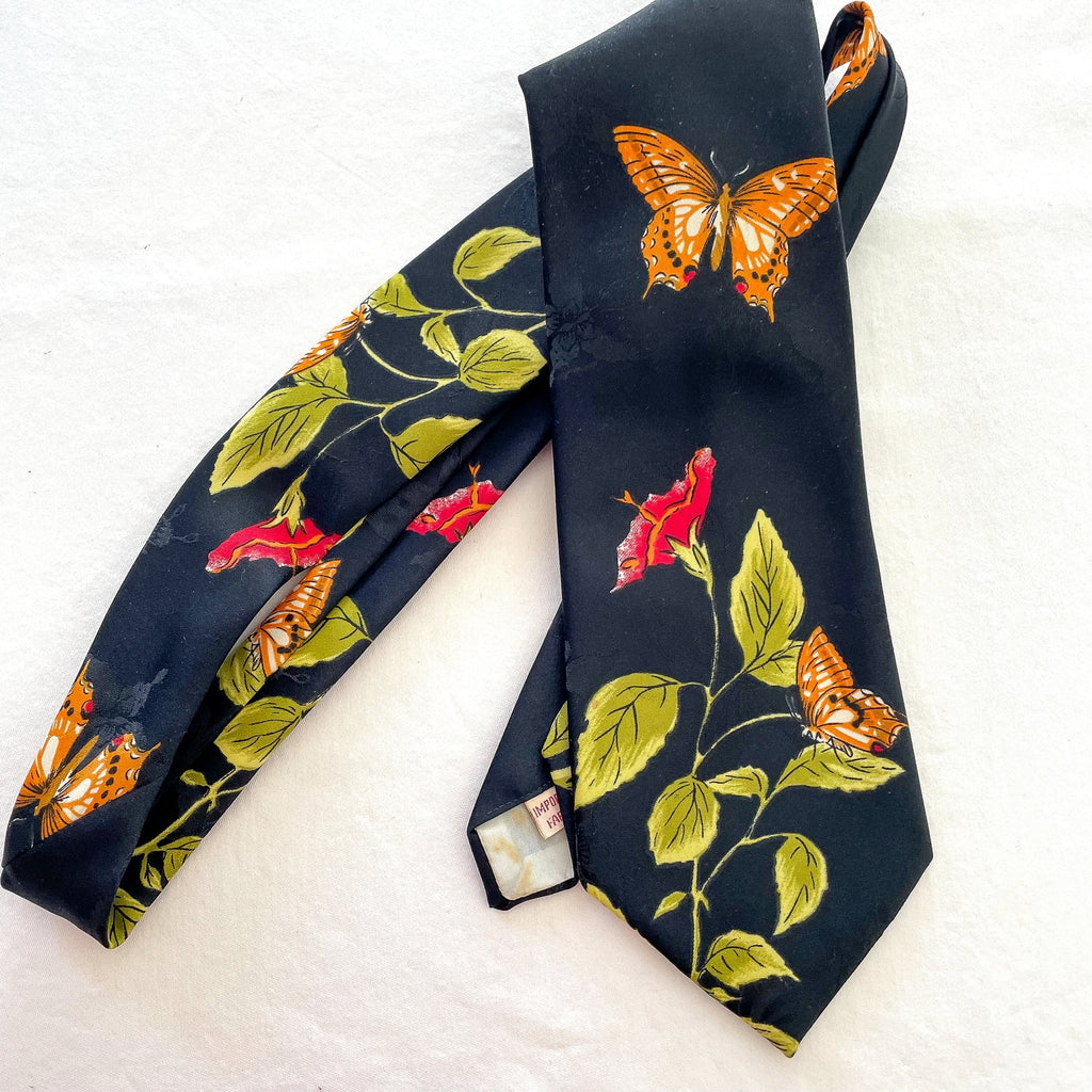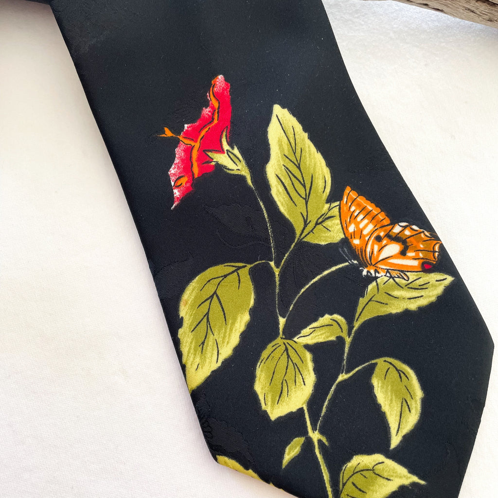 Vintage 70s wide tie with butterflies and flowers.