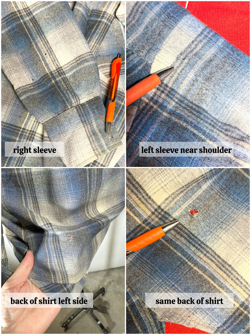 All locations noted are as worn view, holes on right sleeve & cuff, hole on left sleeve near shoulder, hole on back left side. May have other holes not noted.