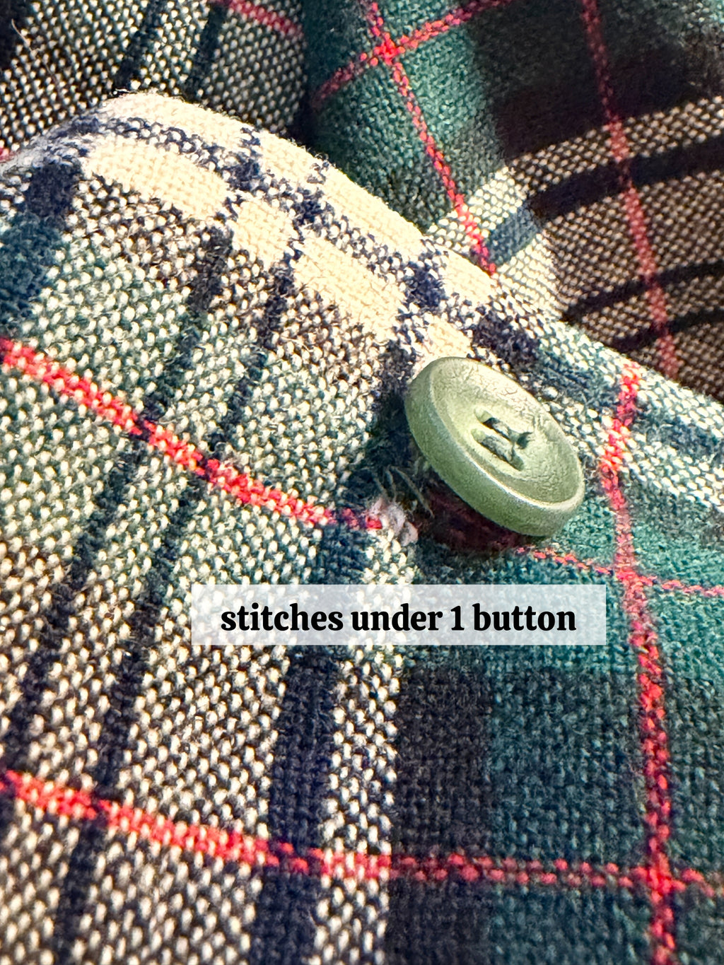 Condition: Overall, very good no holes, several spots as noted. Refer to photos. Clean and ready to wear. One small repair under a button does not show, under wrap front. (see photo).