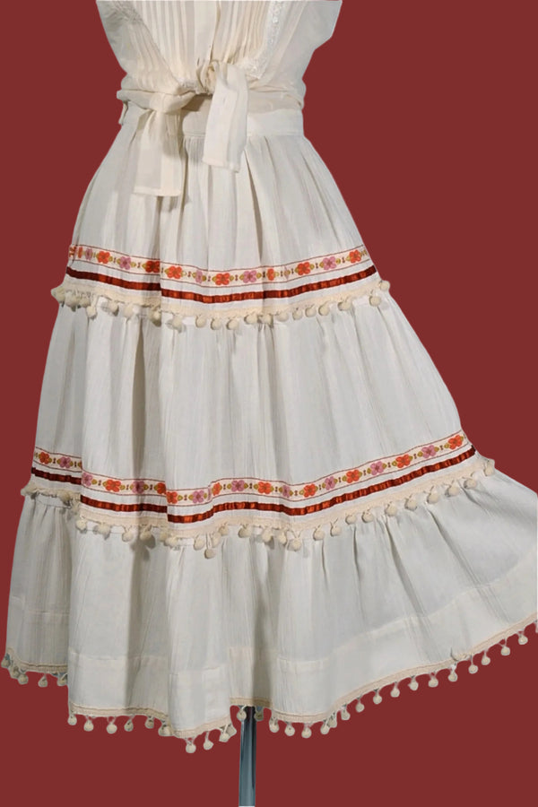 Vintage Festival Skirt, Ribbon + Pom Pom Trim, Boho Hippie Gypsy Skirt