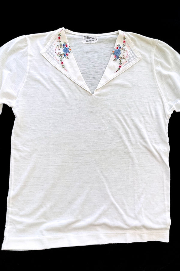 Vintage 70s White T-Shirt Embroidered Collar, Deadstock Unworn L