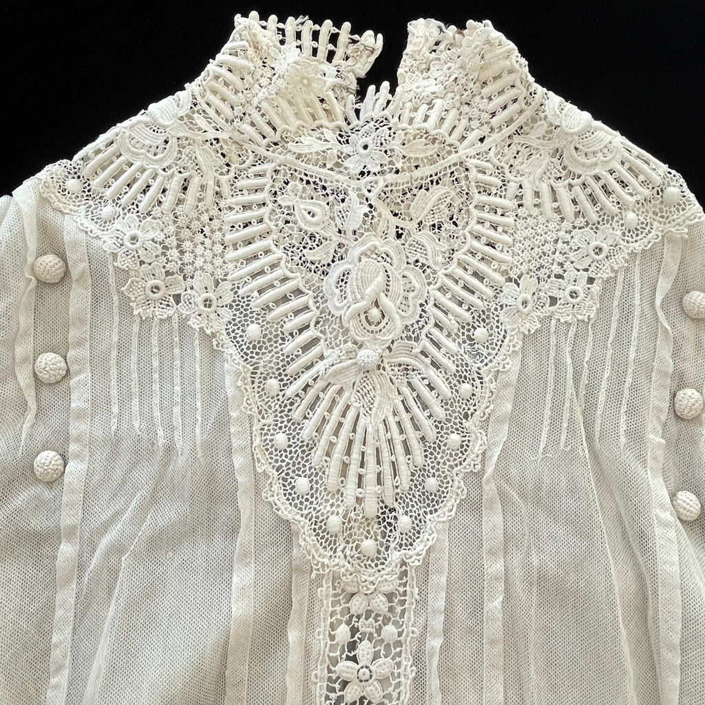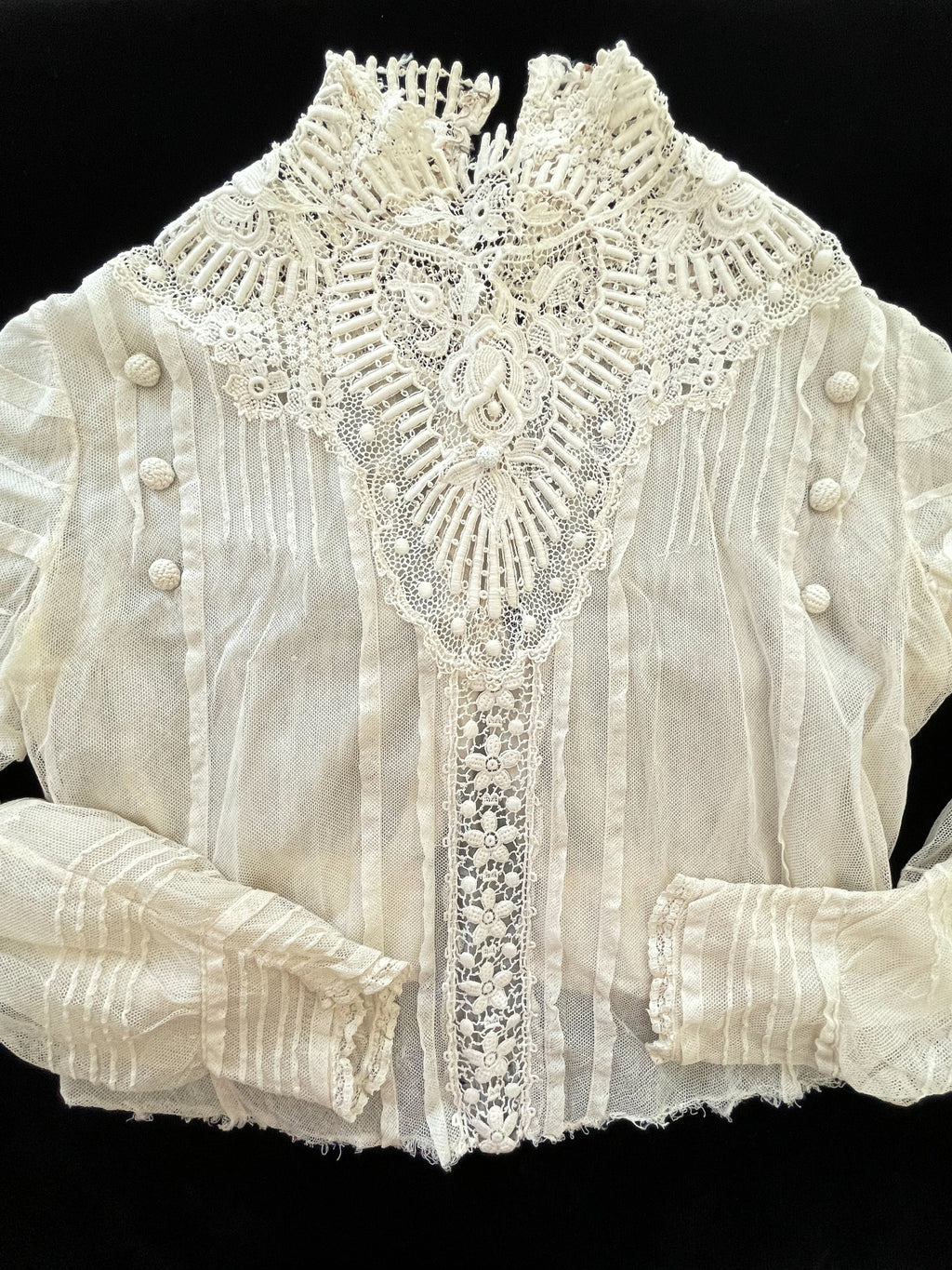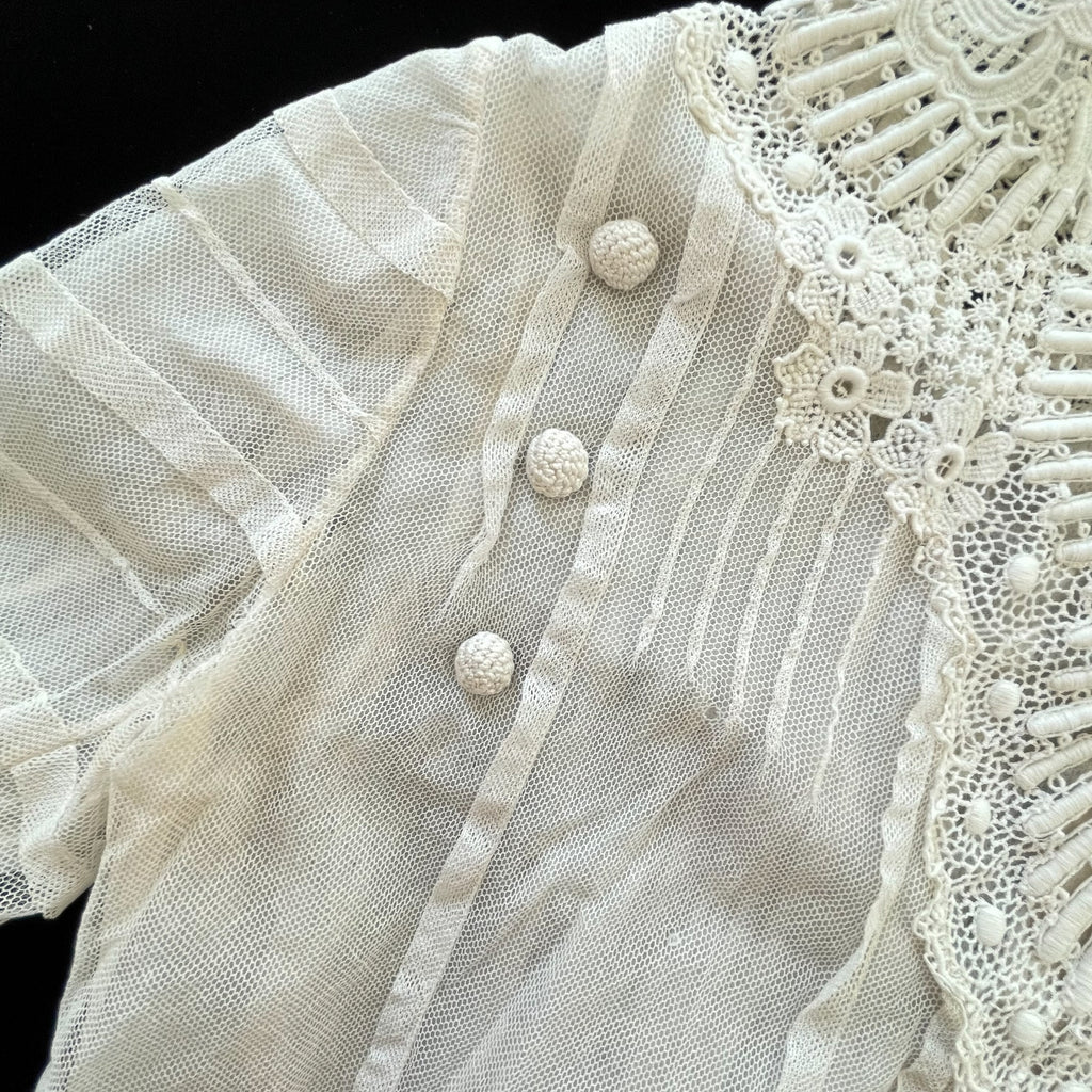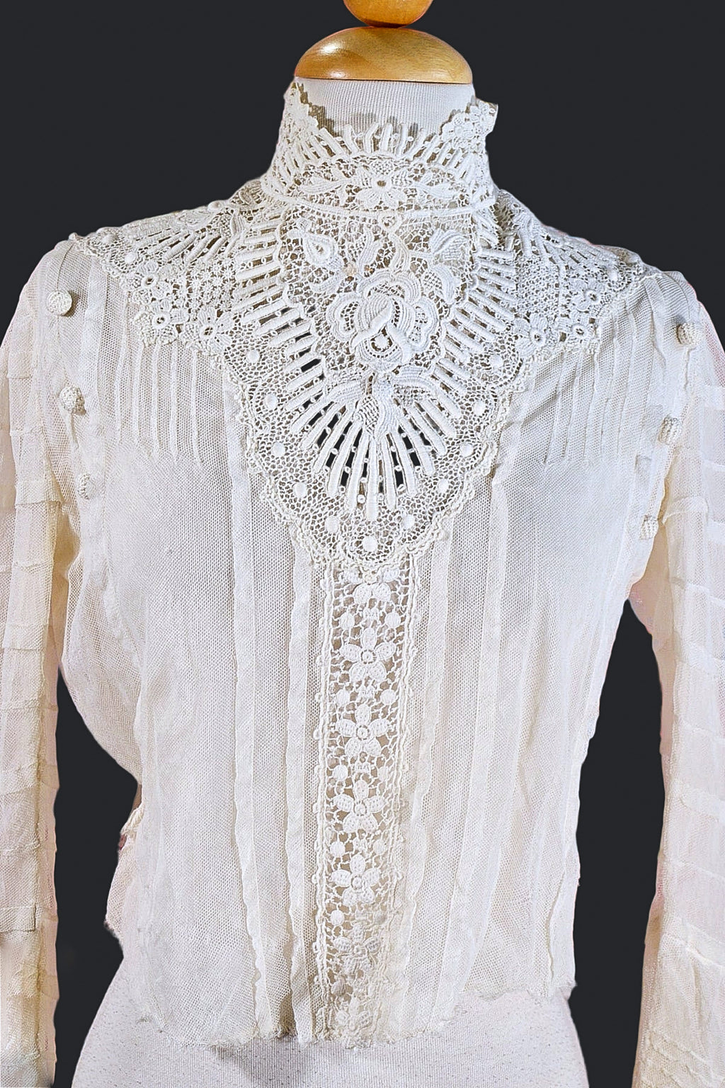 Beautiful antique Edwardian blouse made from lightweight sheer netting.The neckline and front of the blouse have pretty lace detailing. There are small pleats and crochet accent balls on the front of the top.