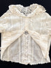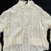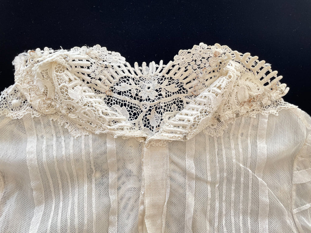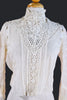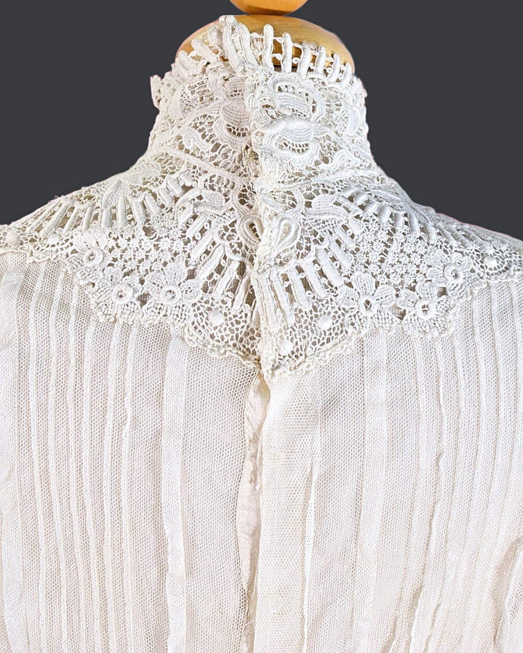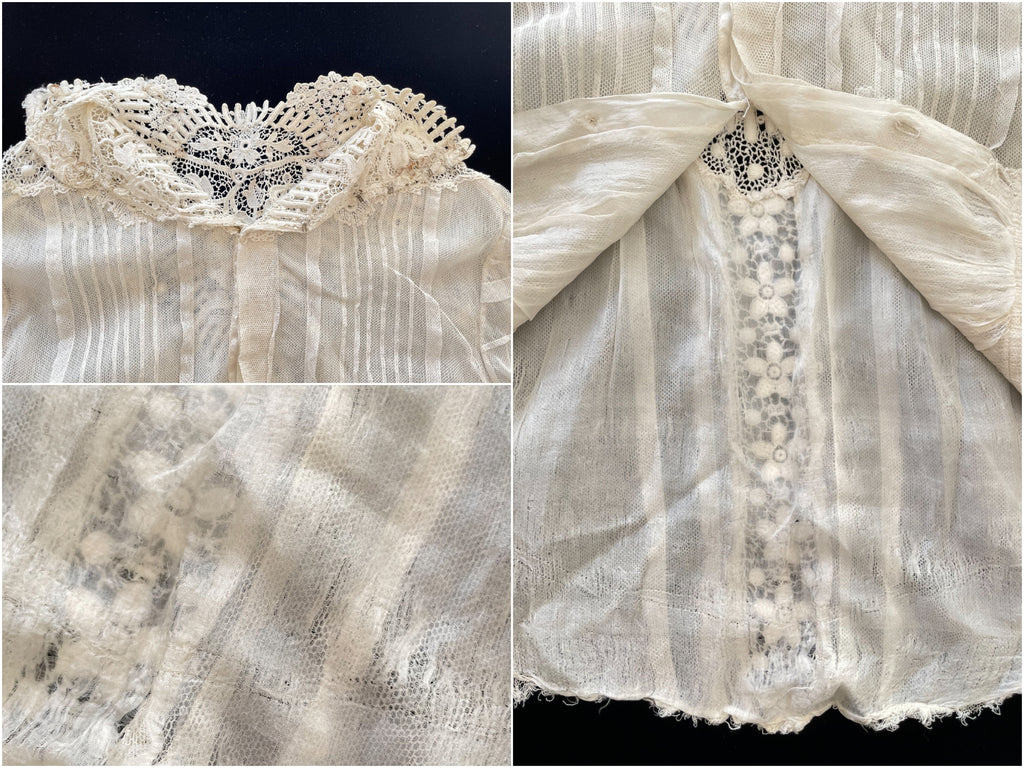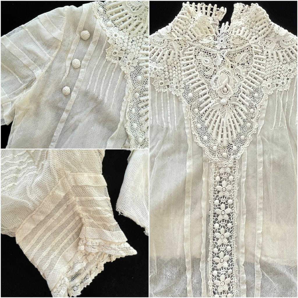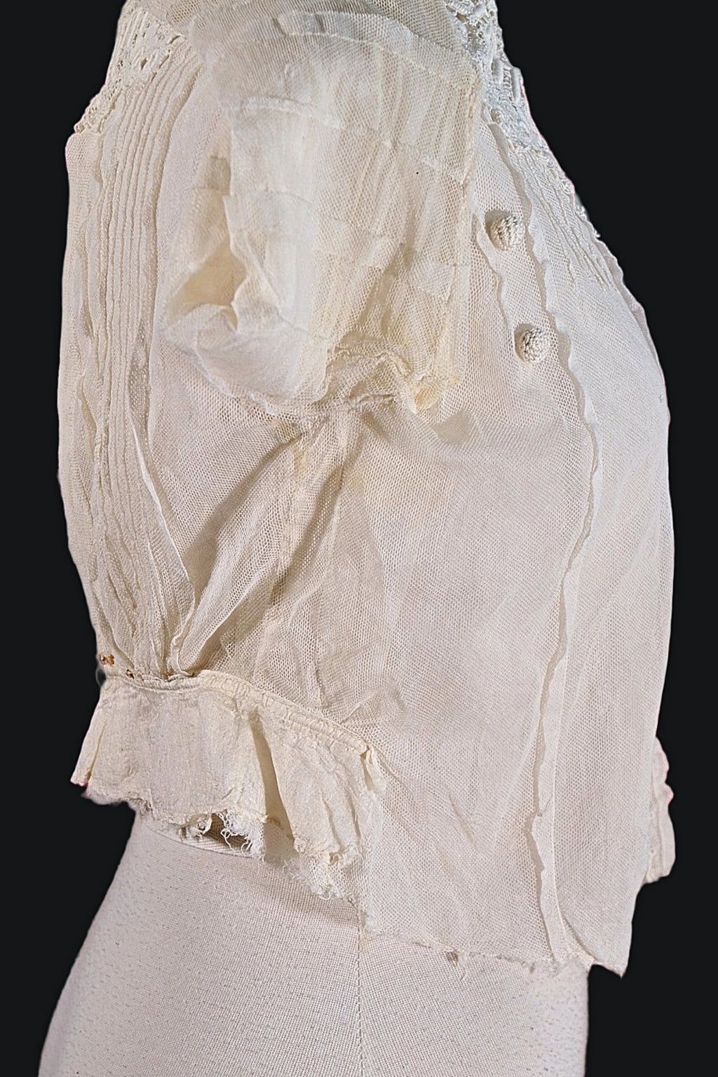 Beautiful antique Edwardian blouse made from lightweight sheer netting.The neckline and front of the blouse have pretty lace detailing. There are small pleats and crochet accent balls on the front of the top.