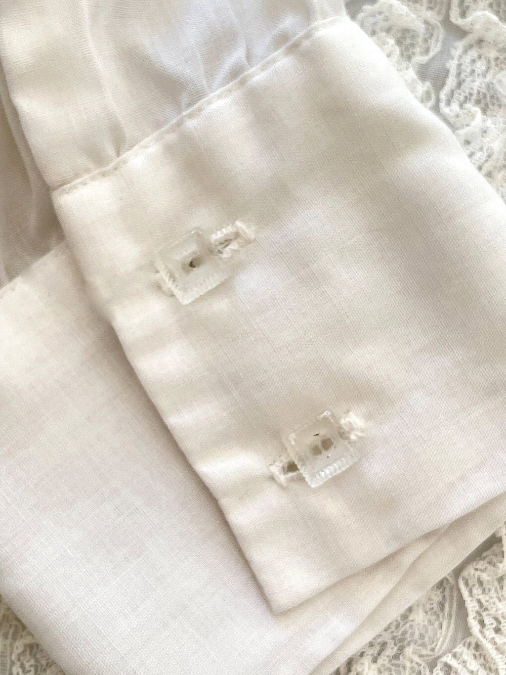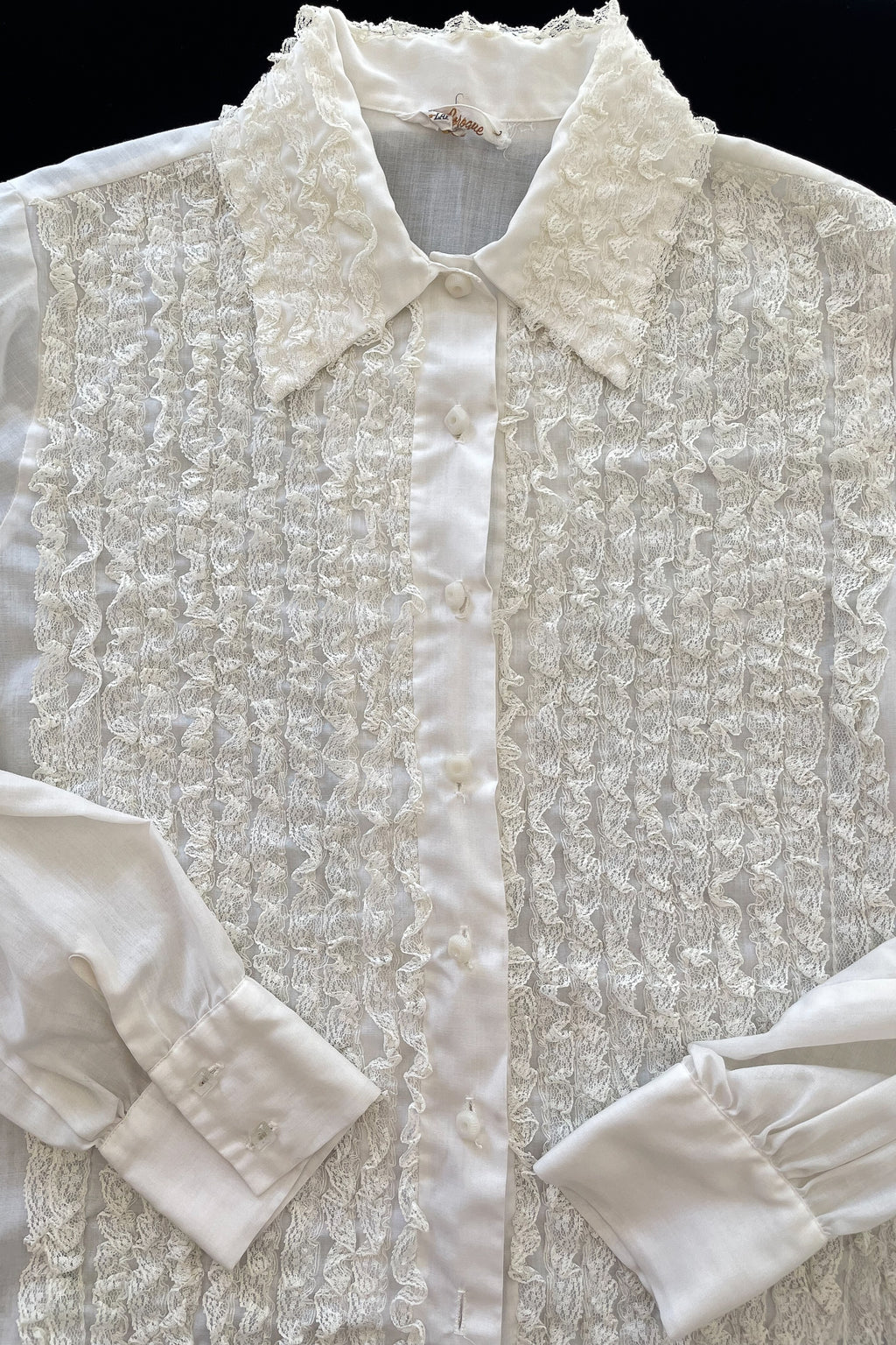 Vintage white cotton/poly blouse with ruffle lace details on the blouse front and collar.