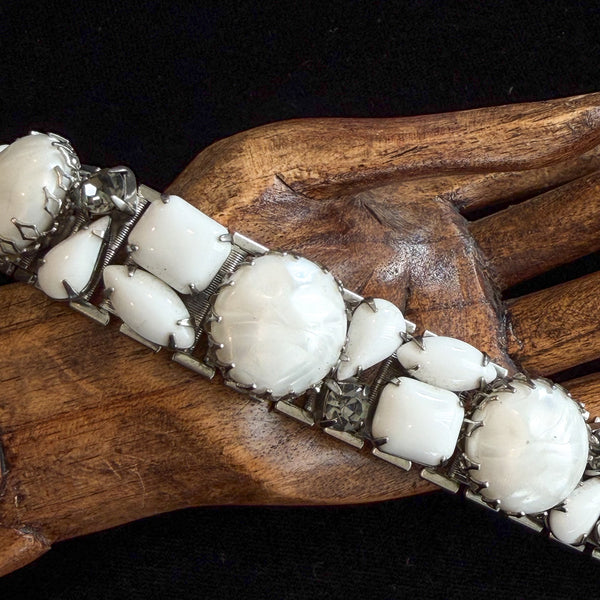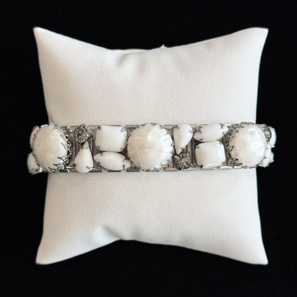 Vintage MCM Milk Glass Beaded Rhinestone Bracelet 7"L