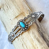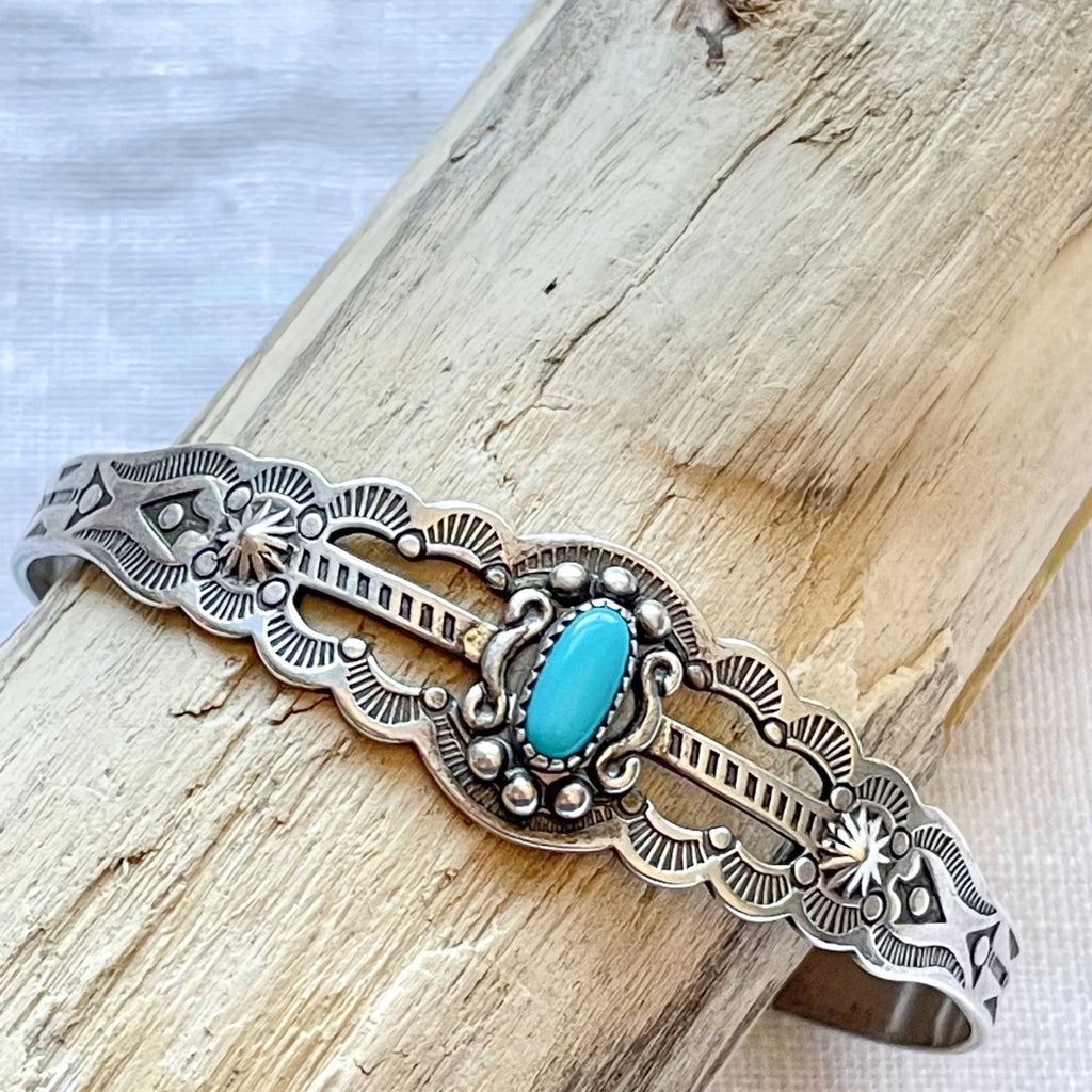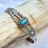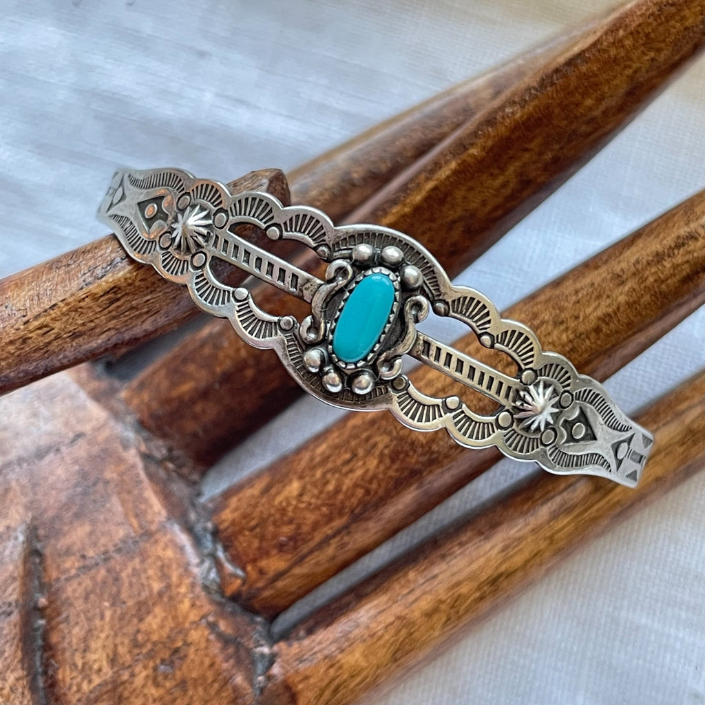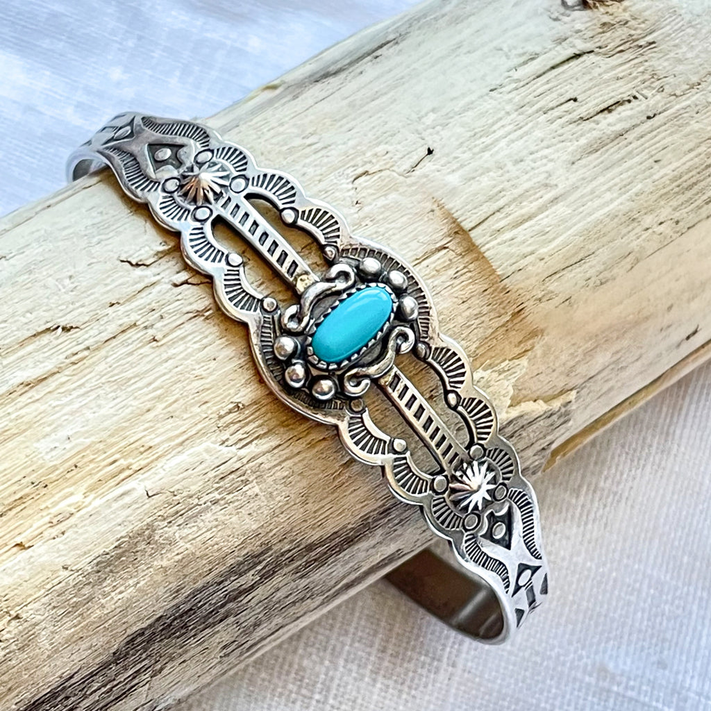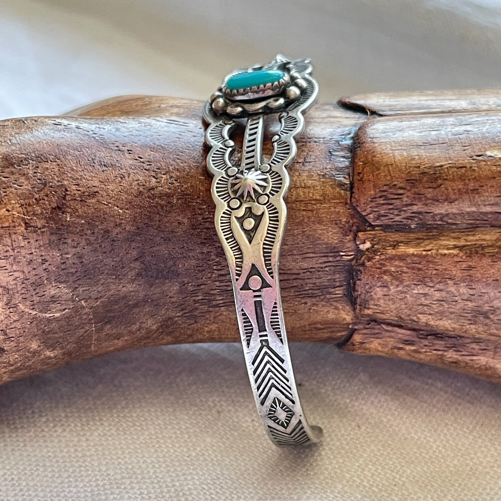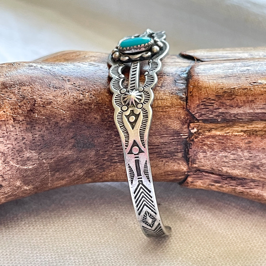 Bracelet is handmade, stamped with lovely Navajo design, small turquoise stone w/silver details surrounding.