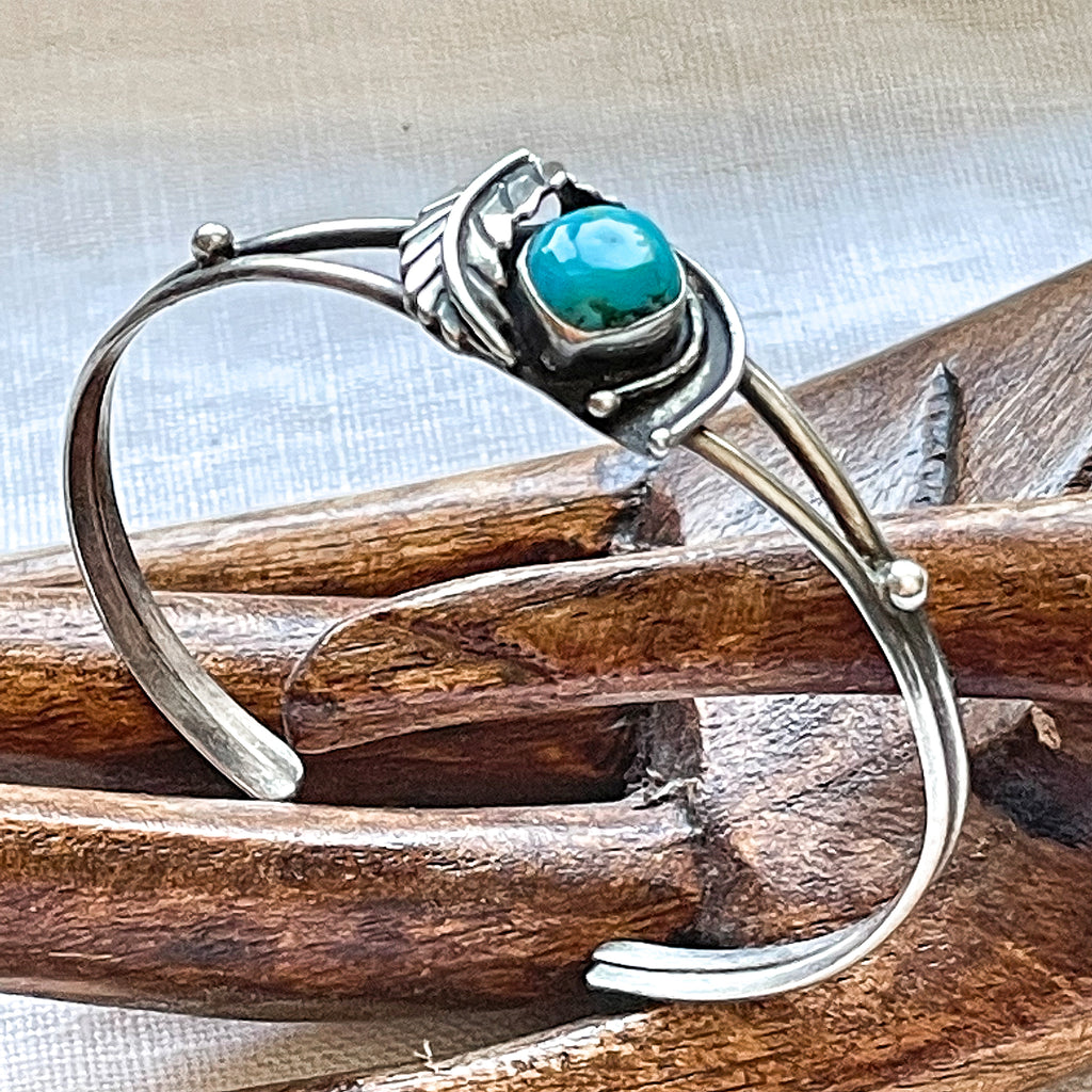 Bracelet is handmade, with swirls, leaf, flower and turquoise stone. Slim shank cuff.