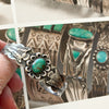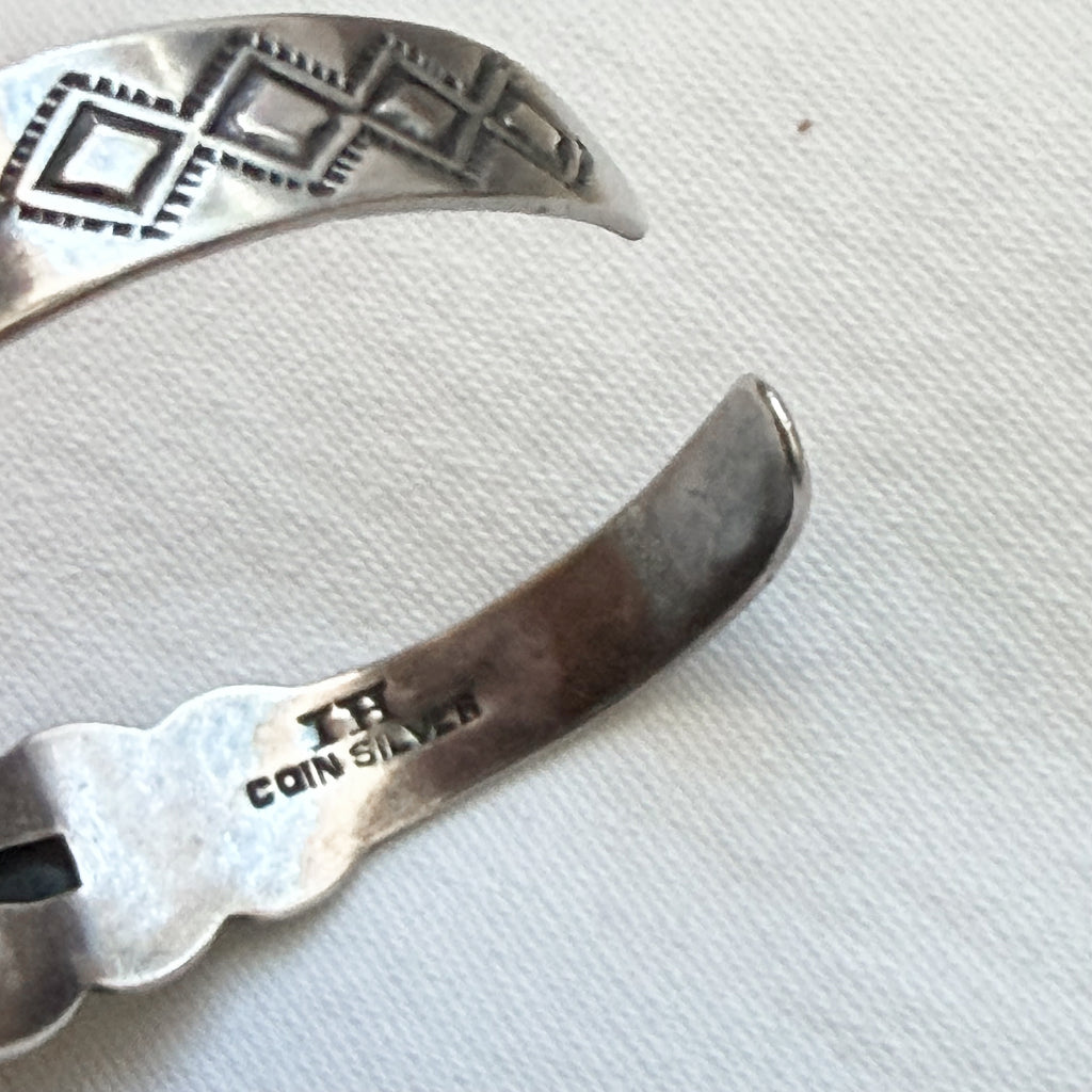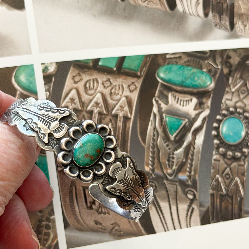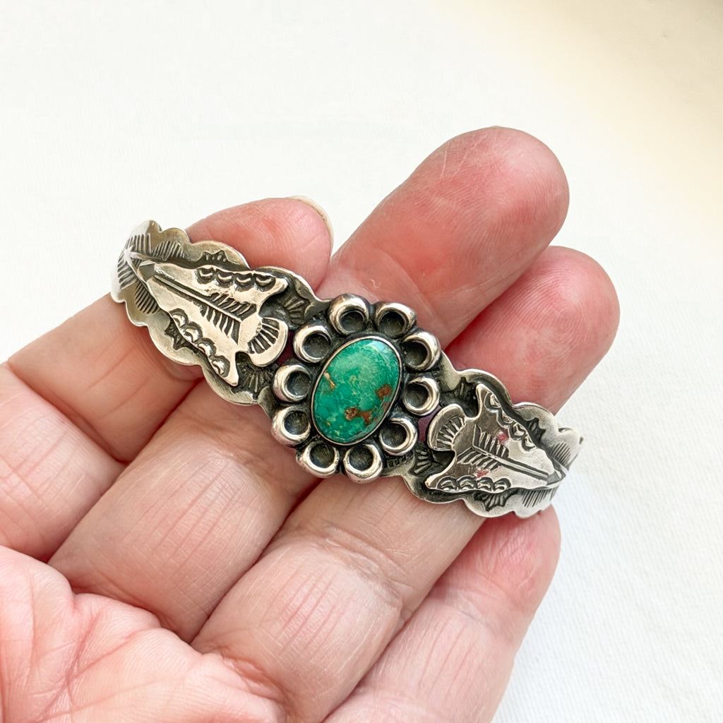 Vintage Fred Harvey era silver bracelet with a turquoise stone in the center.