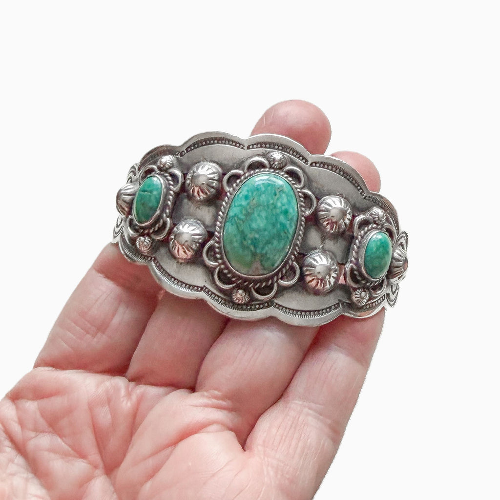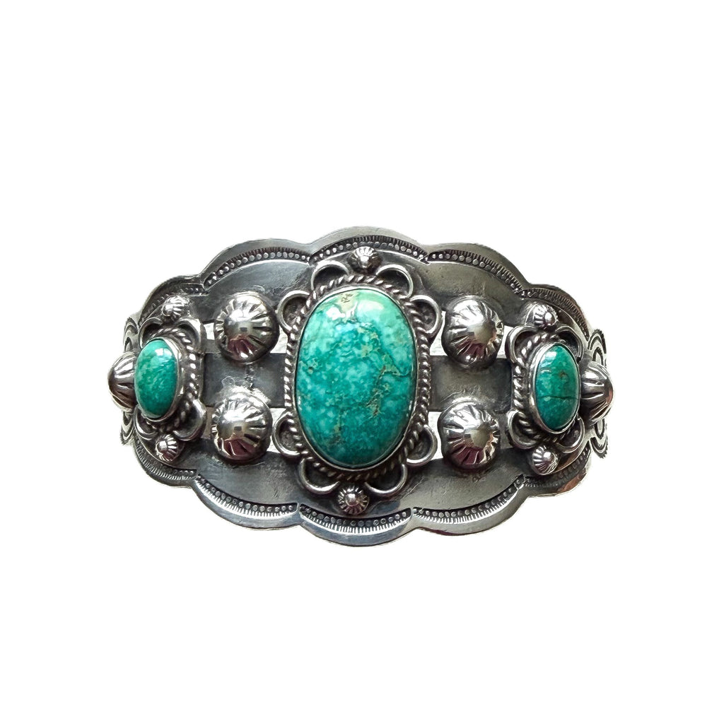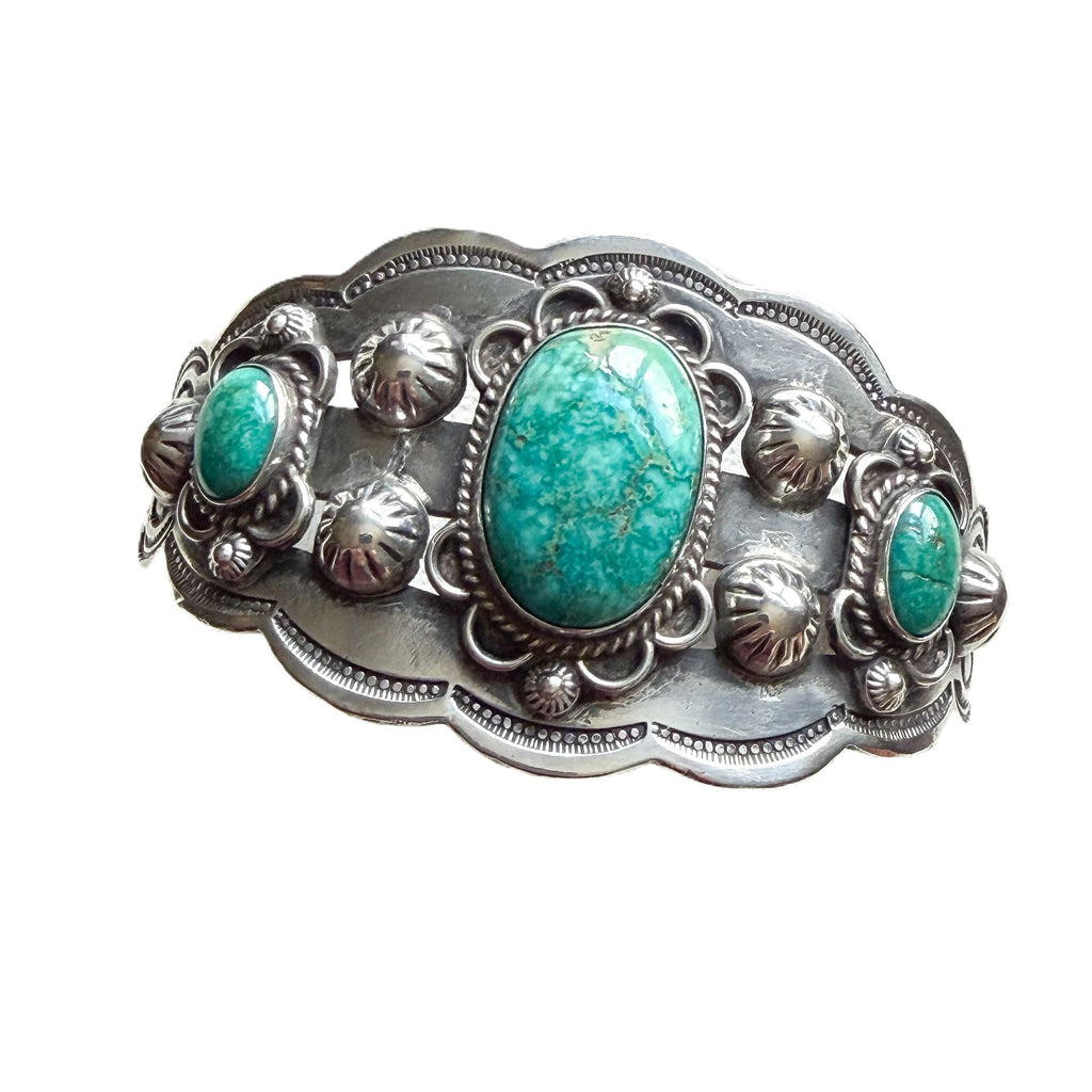 Gorgeous vintage sterling silver cuff bracelet with 3 oval turquoise stones.