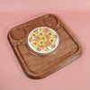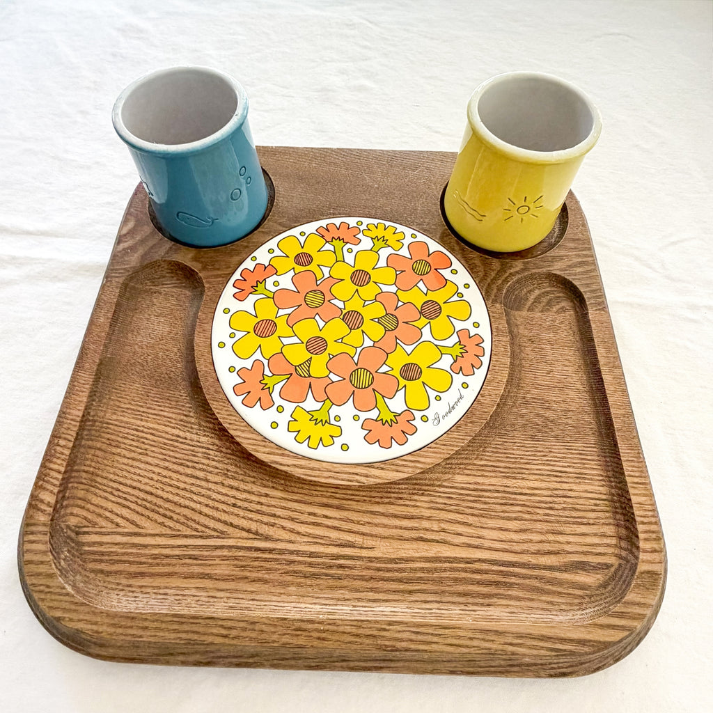 Vintage oak serving tray/platter with a happy floral ceramic tile on center.