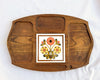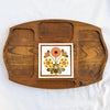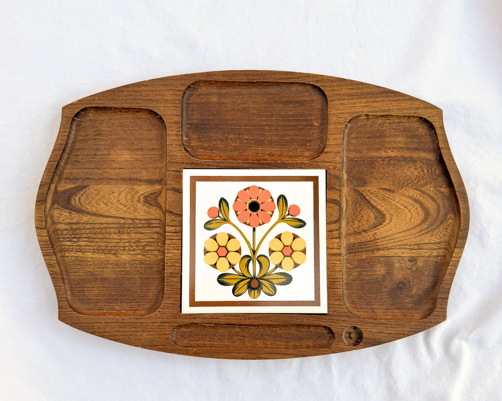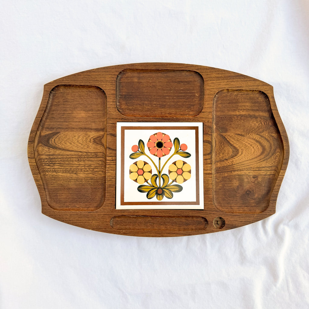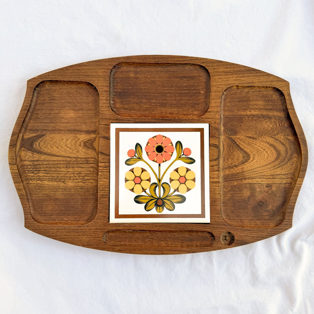 Very nice divided wooden tray with a decorative ceramic tile at the center.