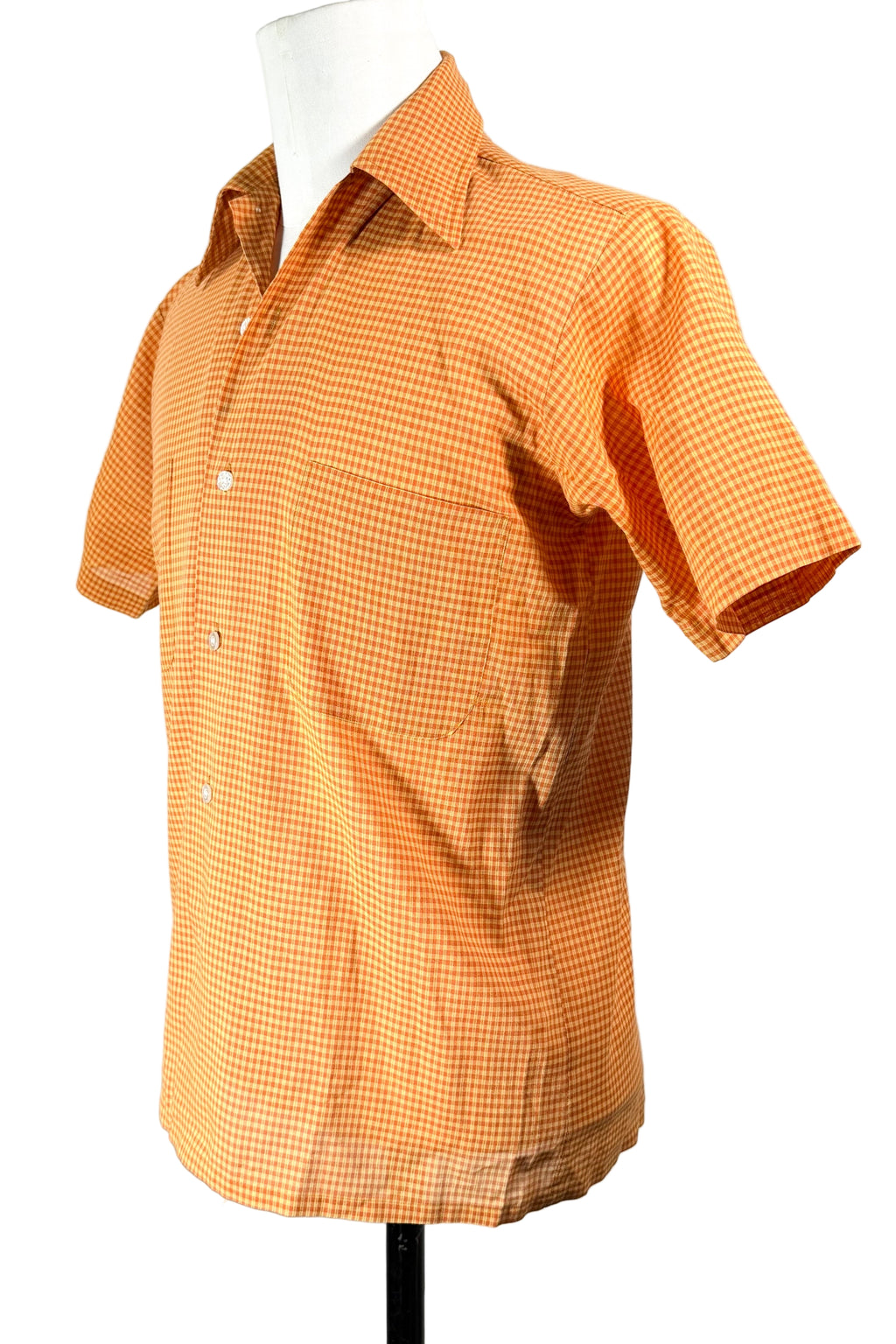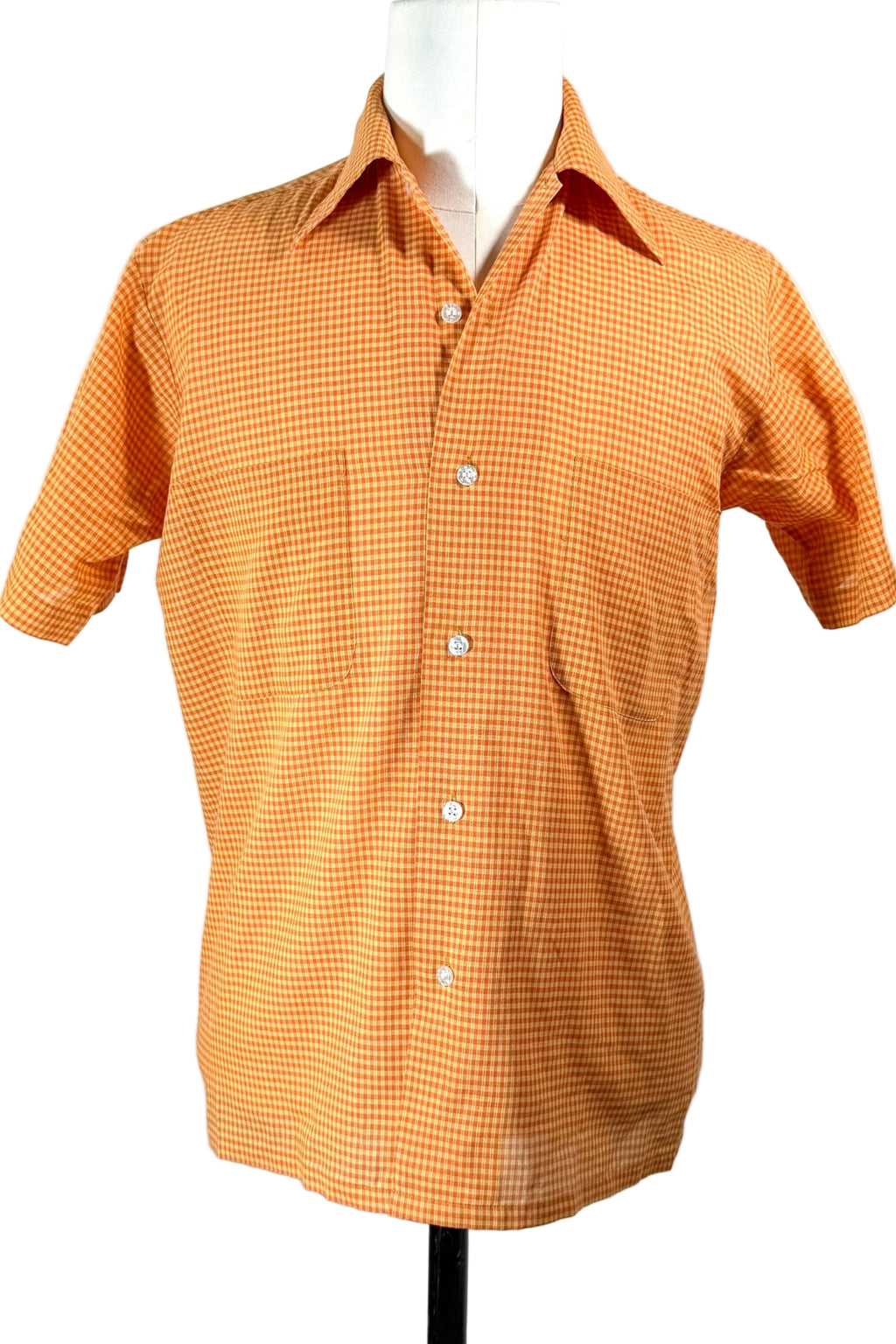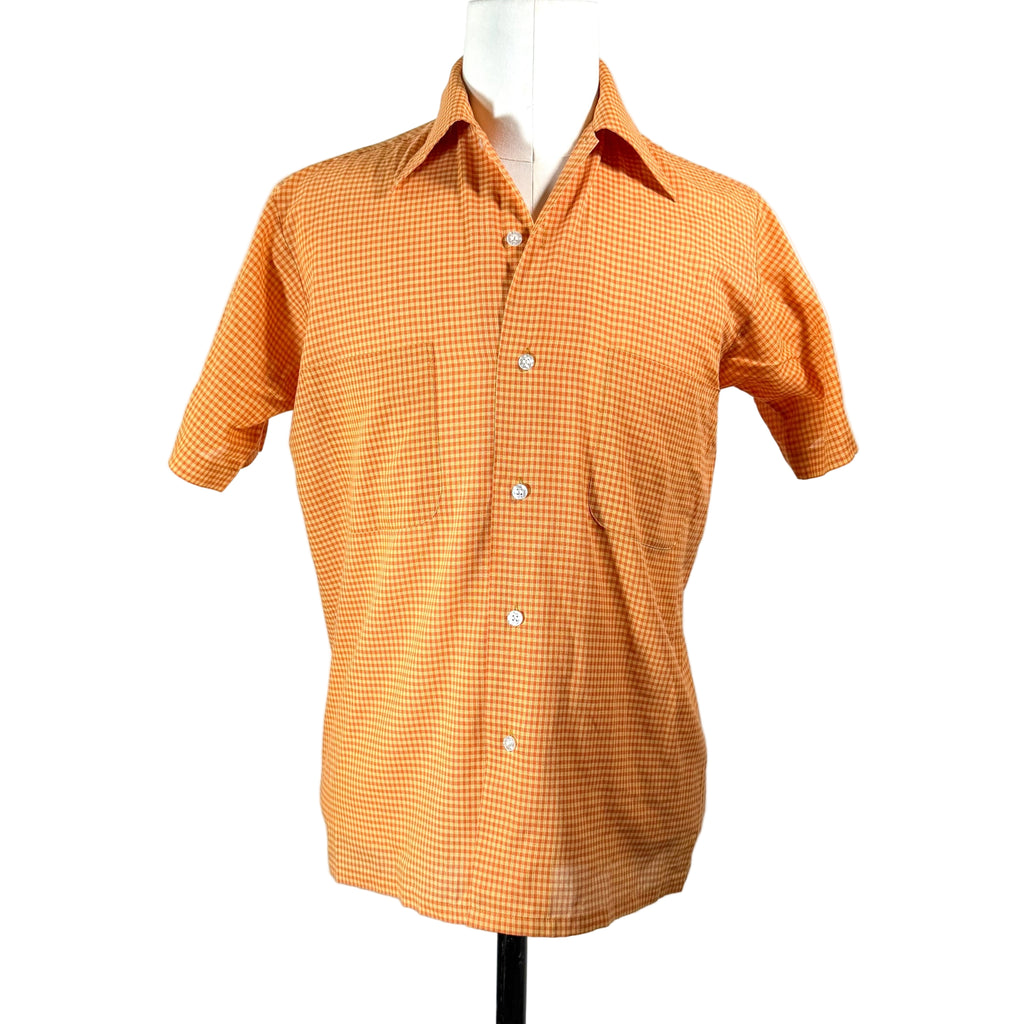Orange, yellow check. Permanent press. Lightweight fabric.