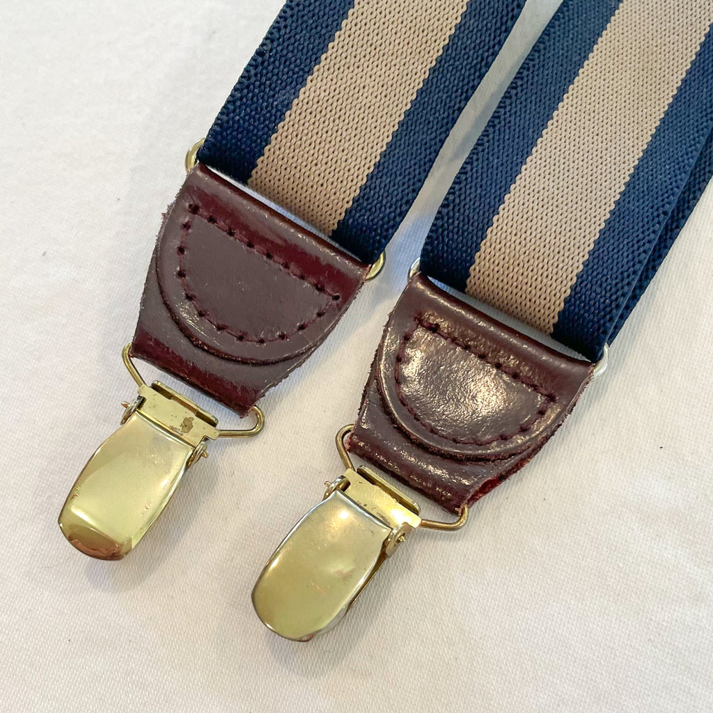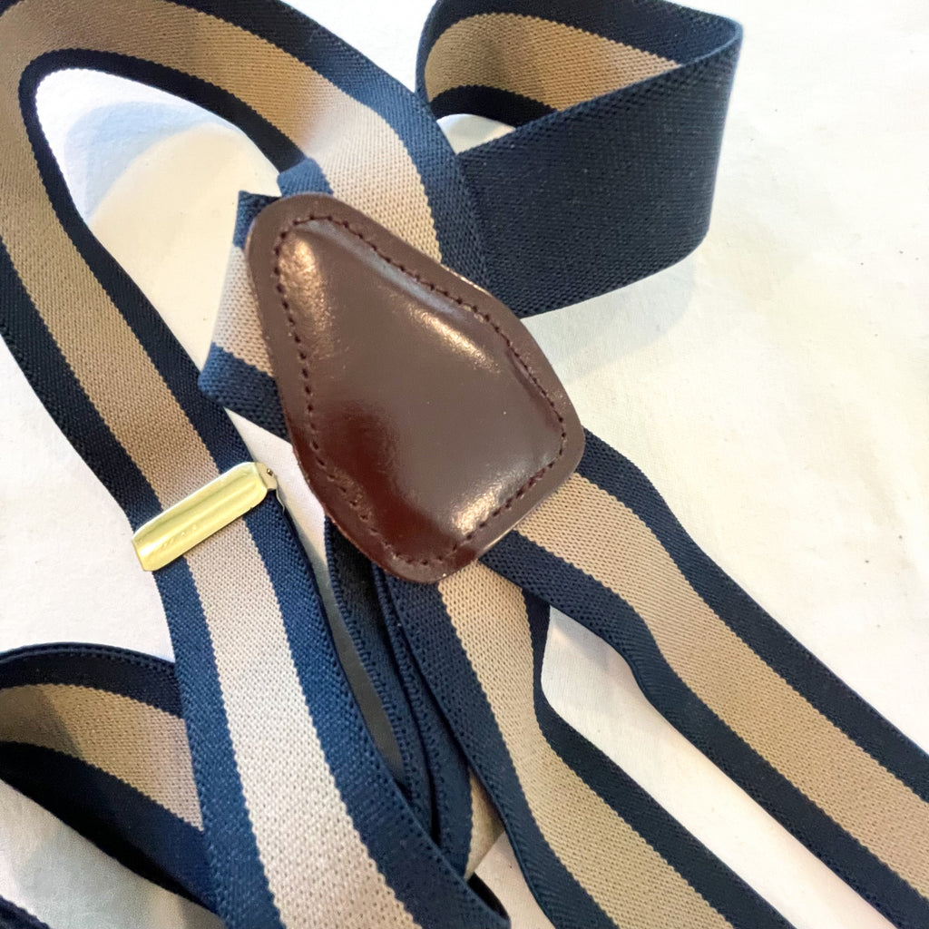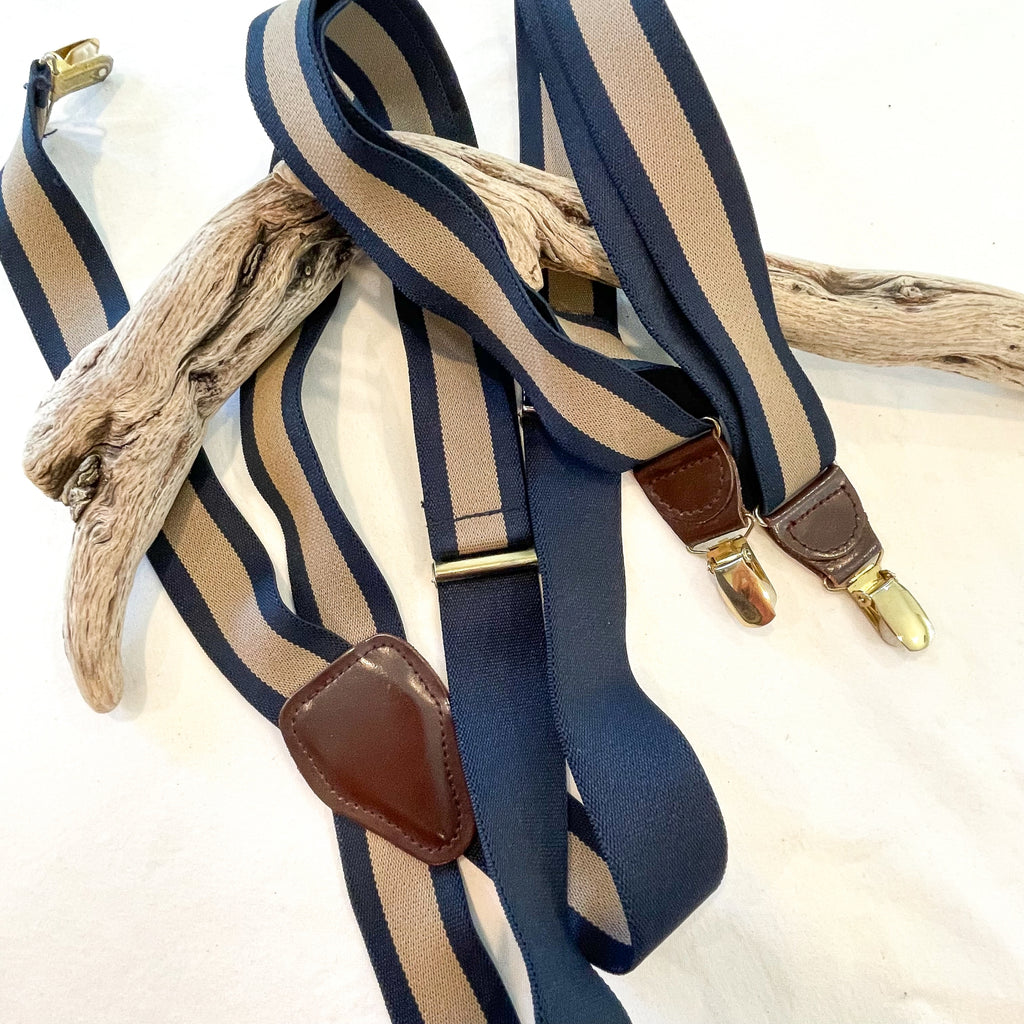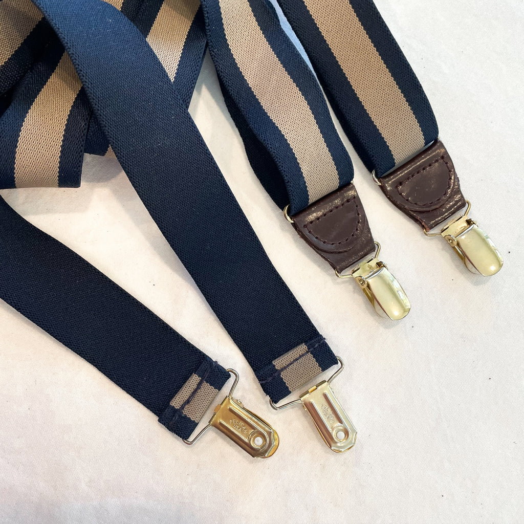 Vintage suspenders navy and taupe striped elastic stretch suspenders with brown leather and brass clips.