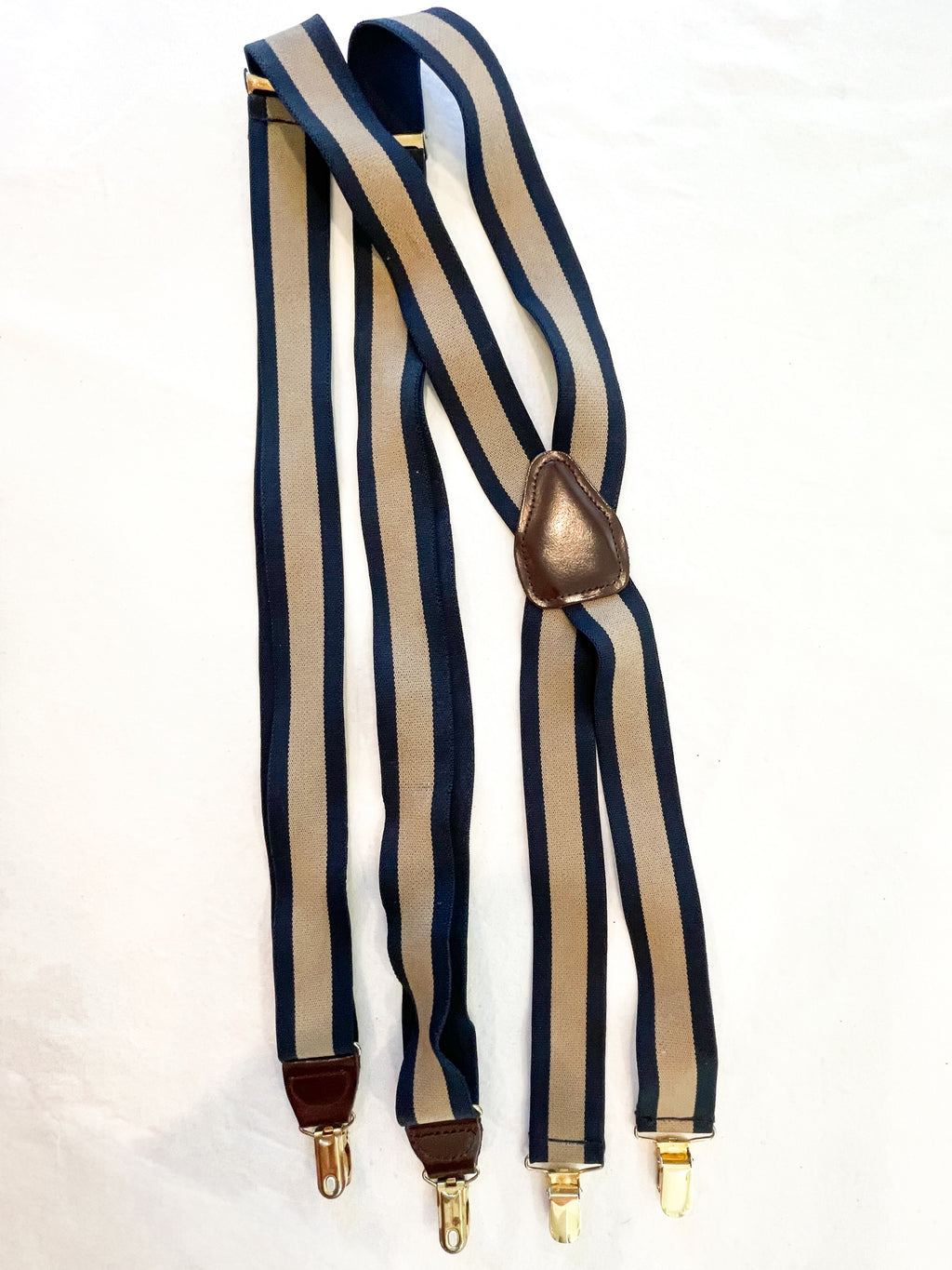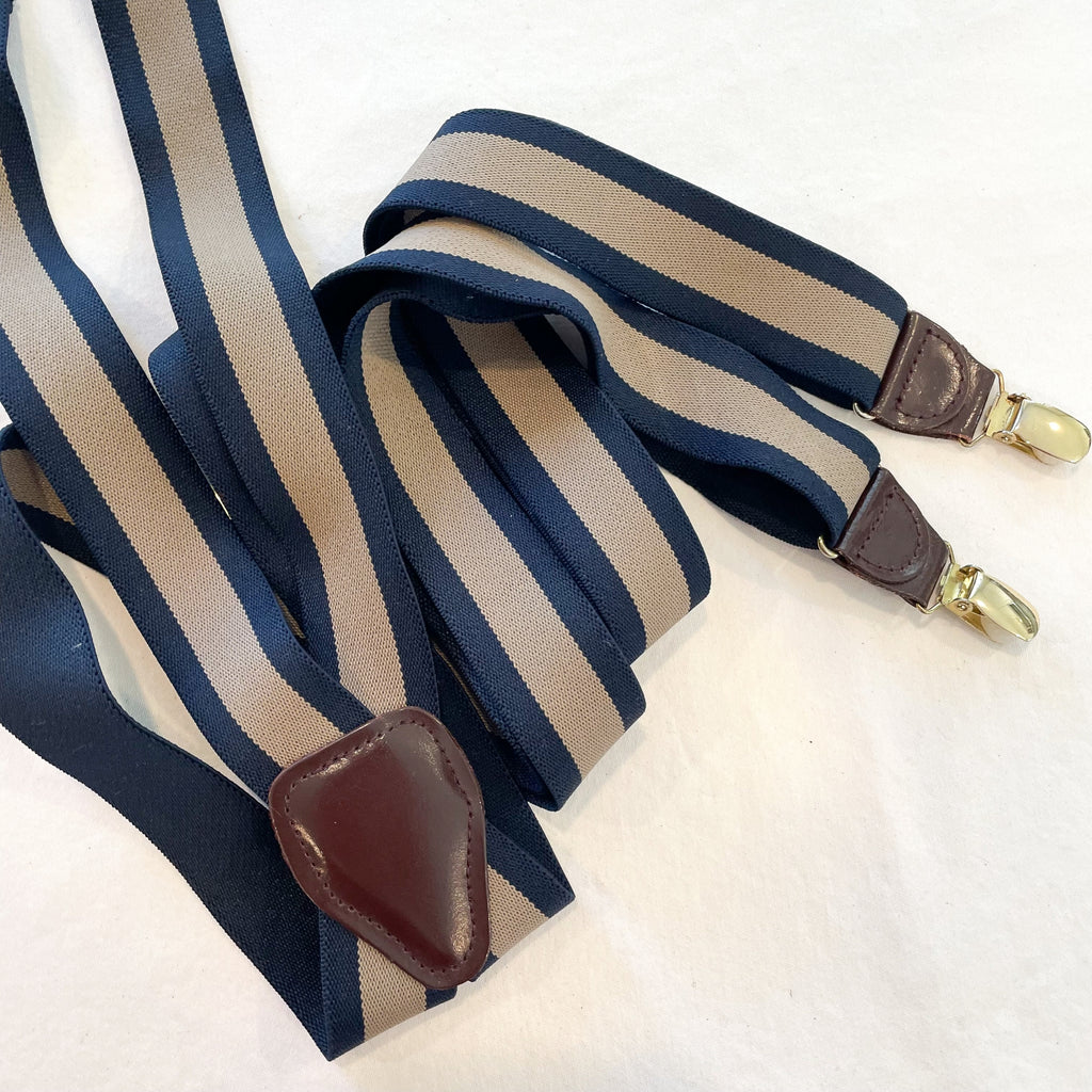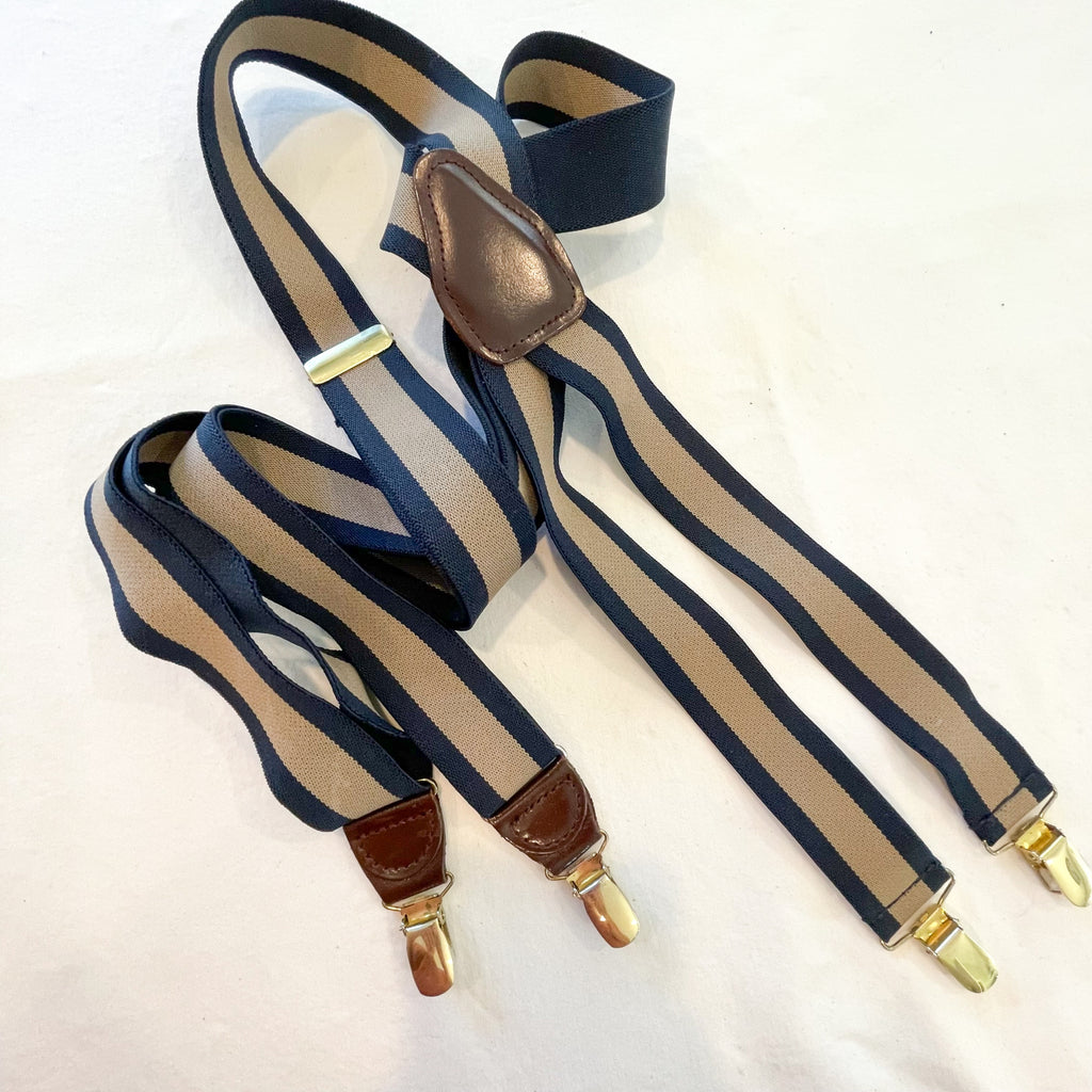 Vintage suspenders navy and taupe striped elastic stretch suspenders with brown leather and brass clips.
