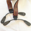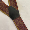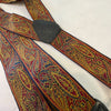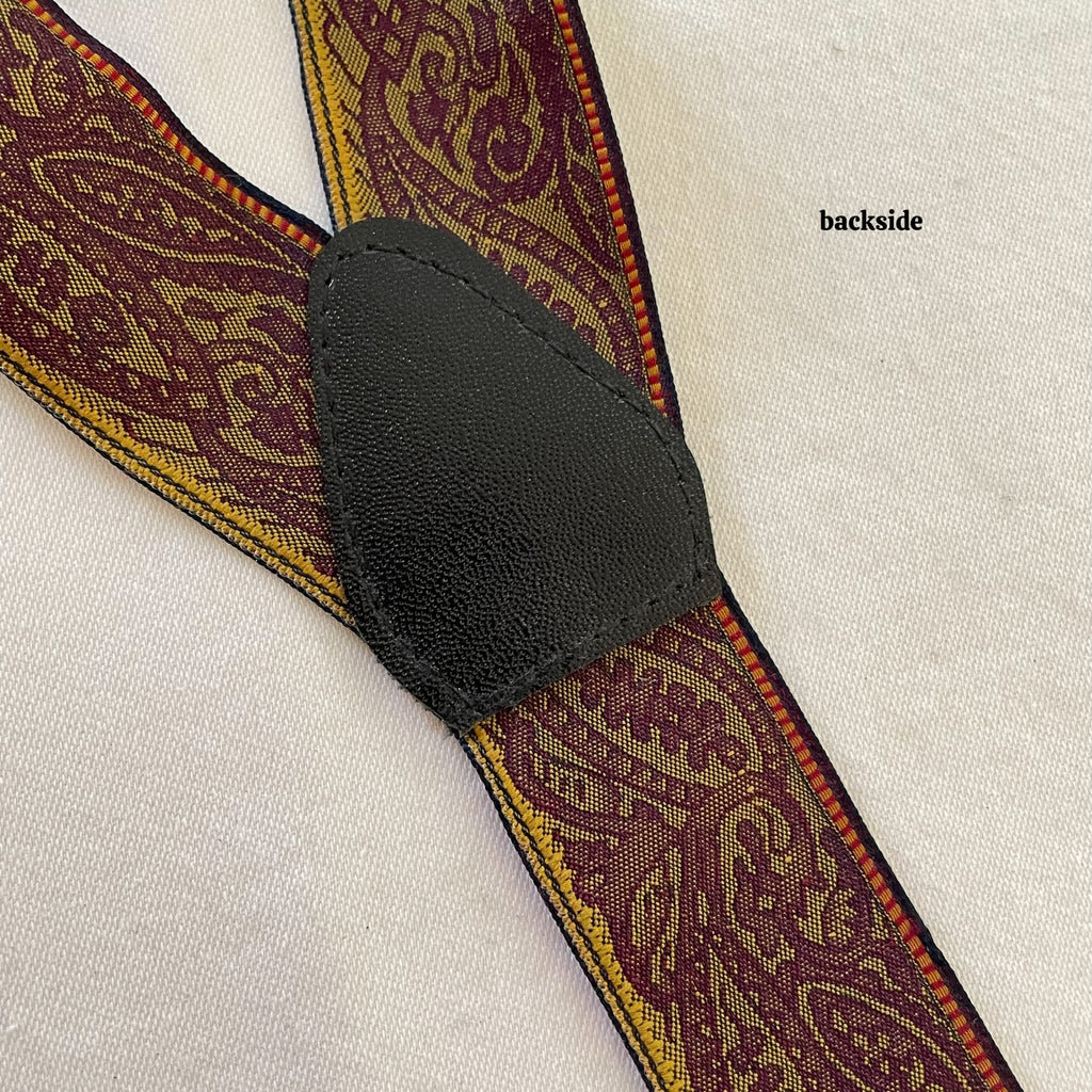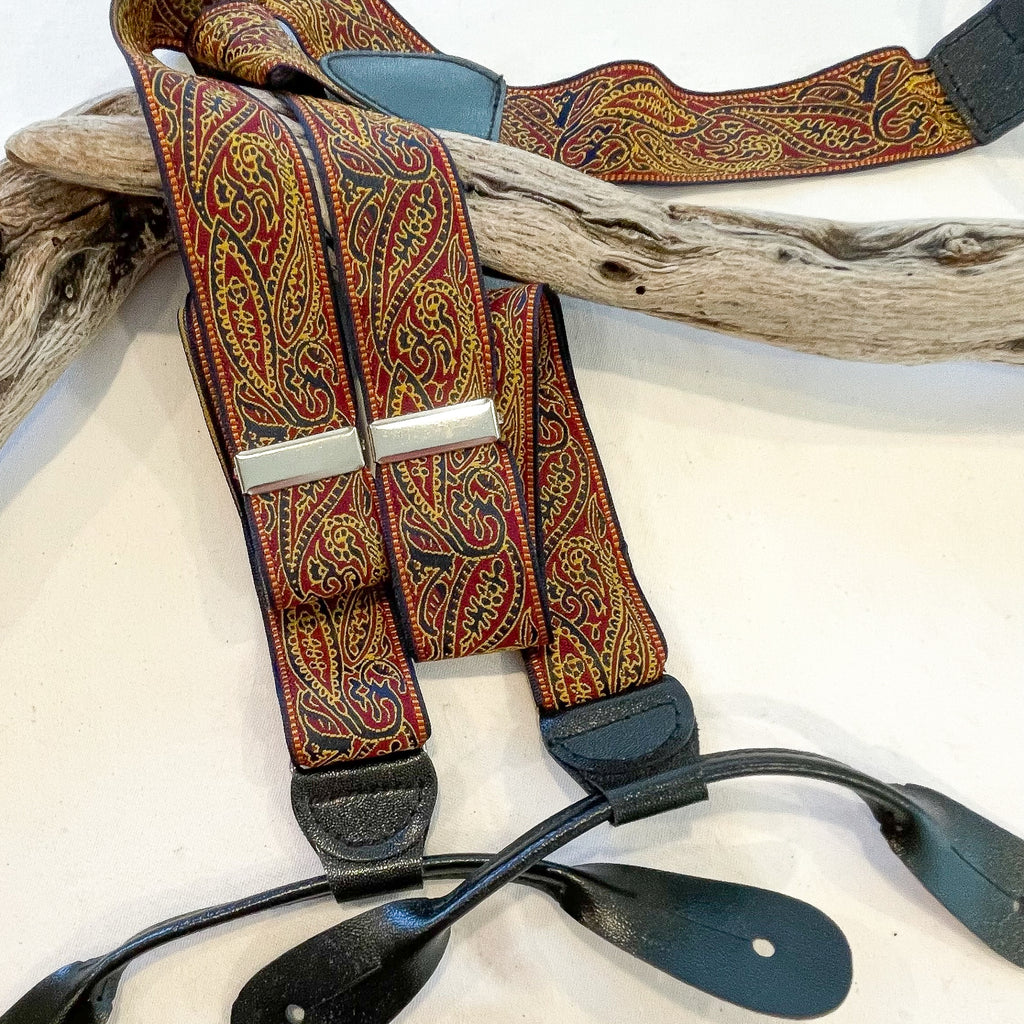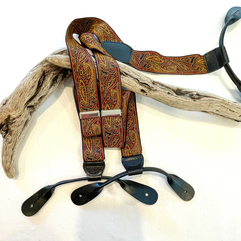 Vintage paisley suspenders, woven ribbon like banding, black leather straps and brass clips for length adjustment. Non stretch.