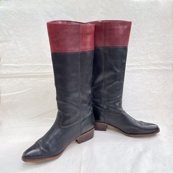 SOLD Vintage 80s Leather Black/Burgundy Leather Boots, Equestrian Style Pull On Boots 9