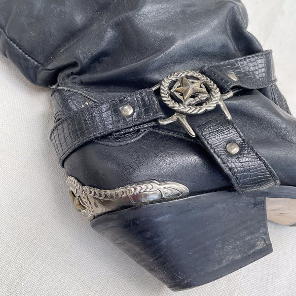 SOLD Vintage 80s Slouchy Ankle Boots, Star Toe/Heel Caps + Belts, Cowboy Booties 7M