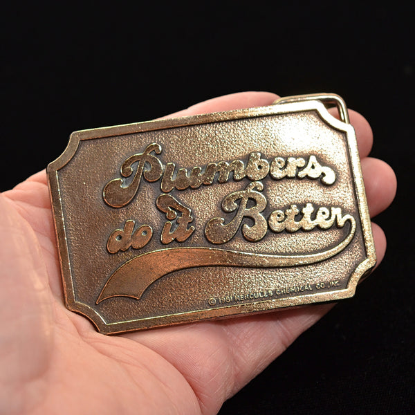 SOLD Vintage 80s Plumbers Do It Best, Brass Belt Buckle, Hercules Chemical Co, 69.4 Grams