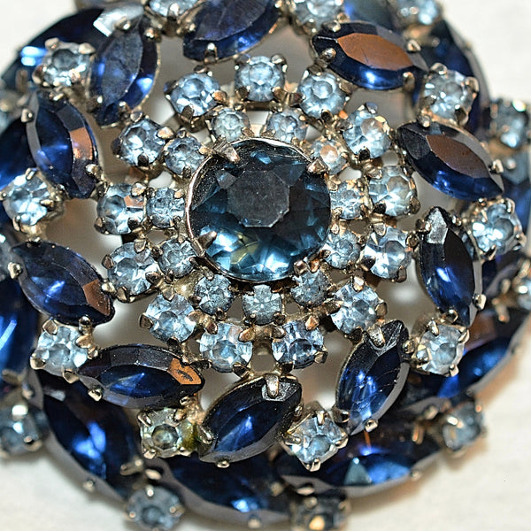 SOLD Vintage Blue Rhinestone Brooch, MCM Costume Jewelry 2" Dia