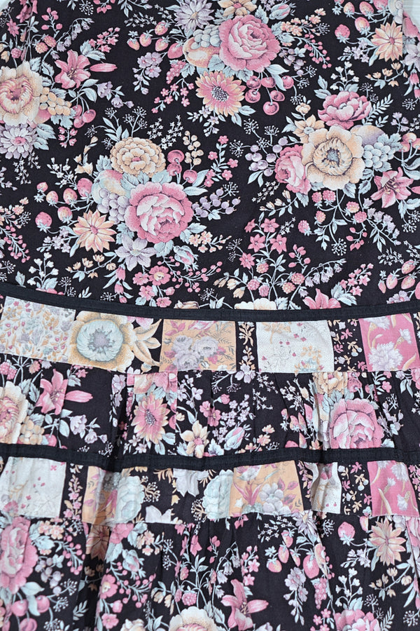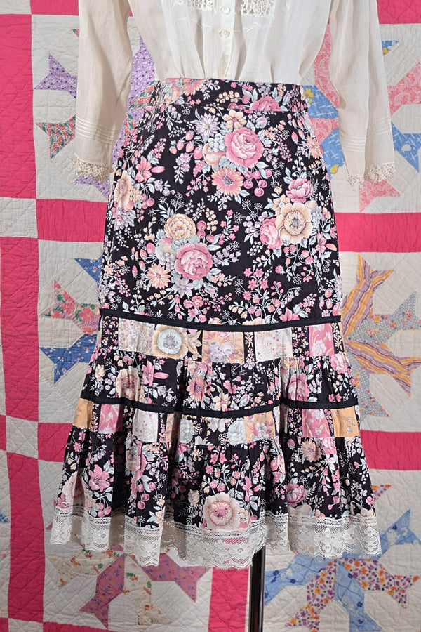 SOLD Vintage Black Rose Print Prairie Skirt, Cottagecore Ruffles XS/S
