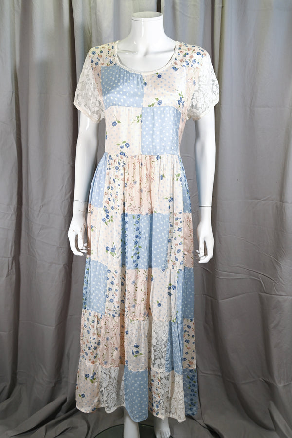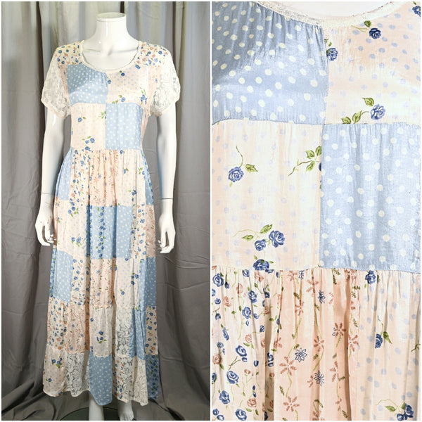 SOLD Vintage 90s Patchwork Cottagecore Long Dress, Sash Tie