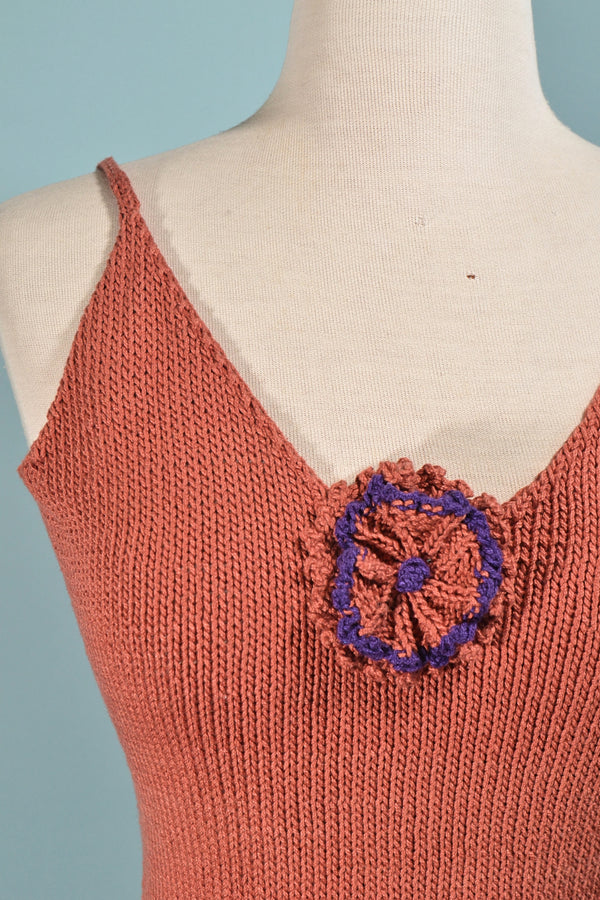 SOLD Vintage Knit Top with Flower Detail, Hand Knit Top S