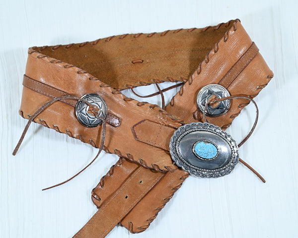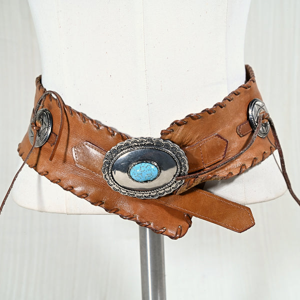 SOLD Vintage Leather Southwestern Concho Belt, Silvertone Faux Turquoise Stone, Damaged Stone
