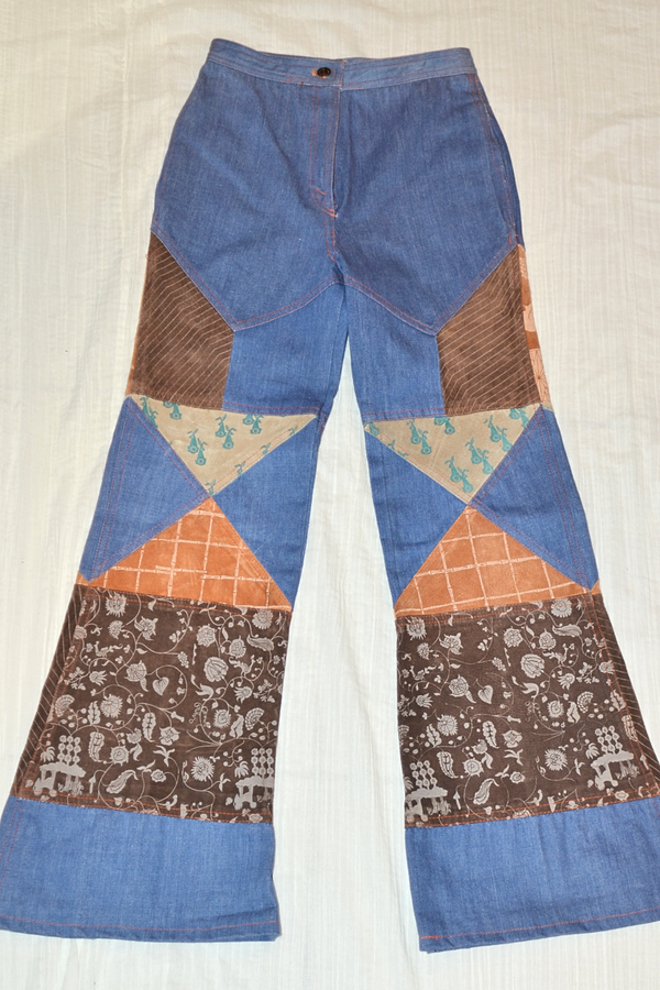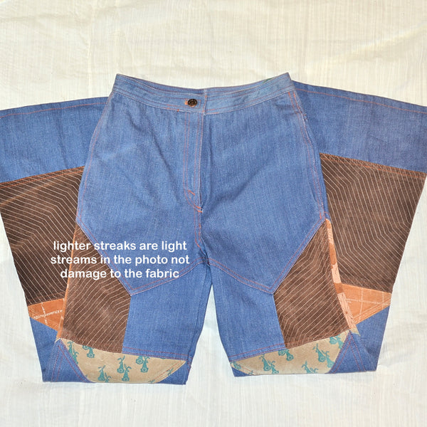 SOLD Vintage Patchwork Denim/Leather Jeans, Boho Penny Lane Bell Bottoms XS