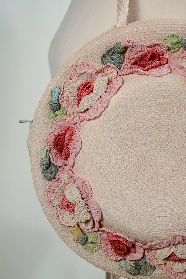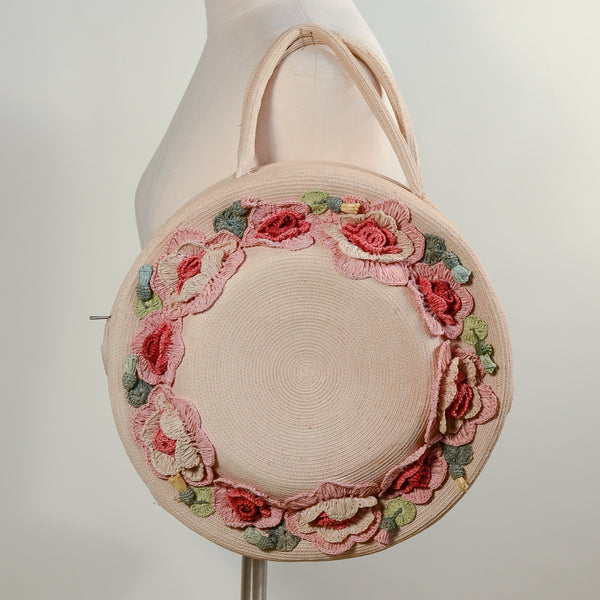 SOLD Vintage Round Woven Handbag with Pretty Raffia Flowers