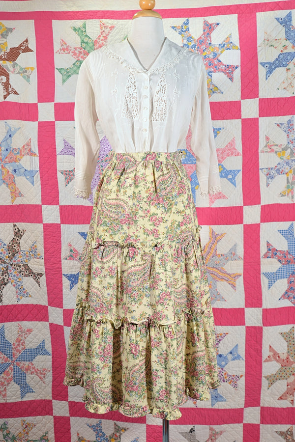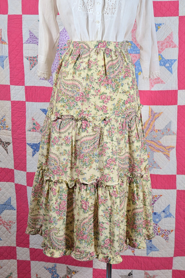 SOLD Vintage Prairie Skirt, Yellow Paisley Print + Ruffles Cottagecore Skirt M
