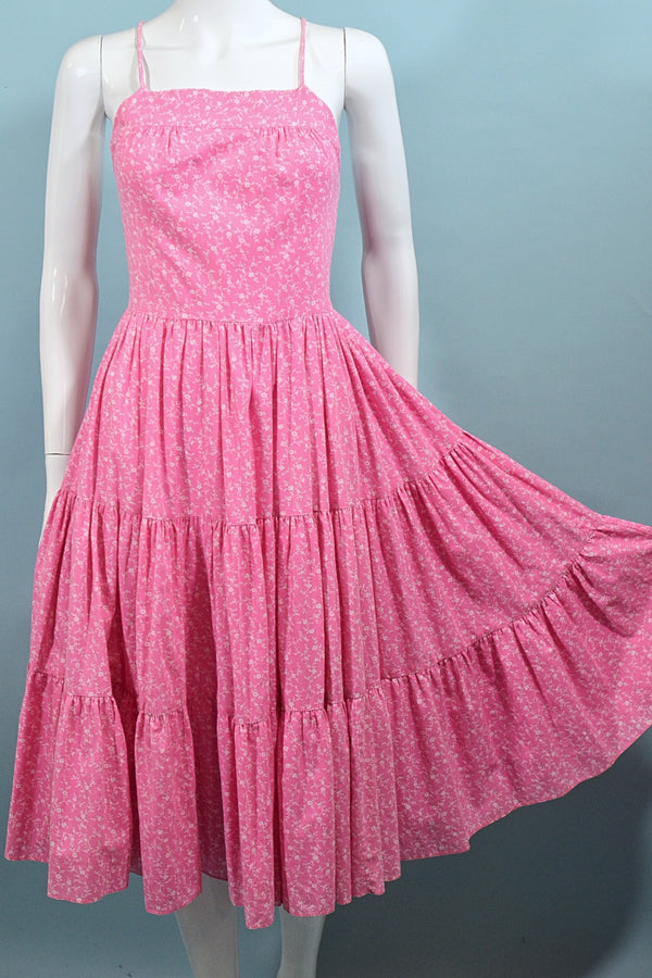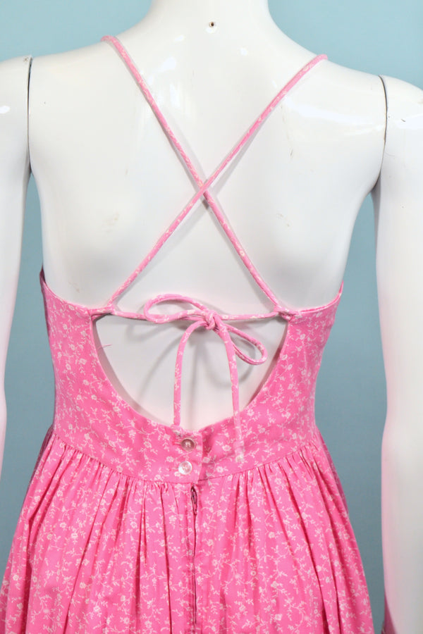 SOLD Vintage Pink Floral Sundress, Cottagecore Strappy Lowcut Back, Full Skirt S